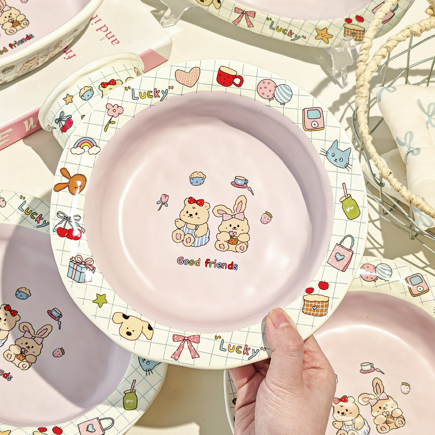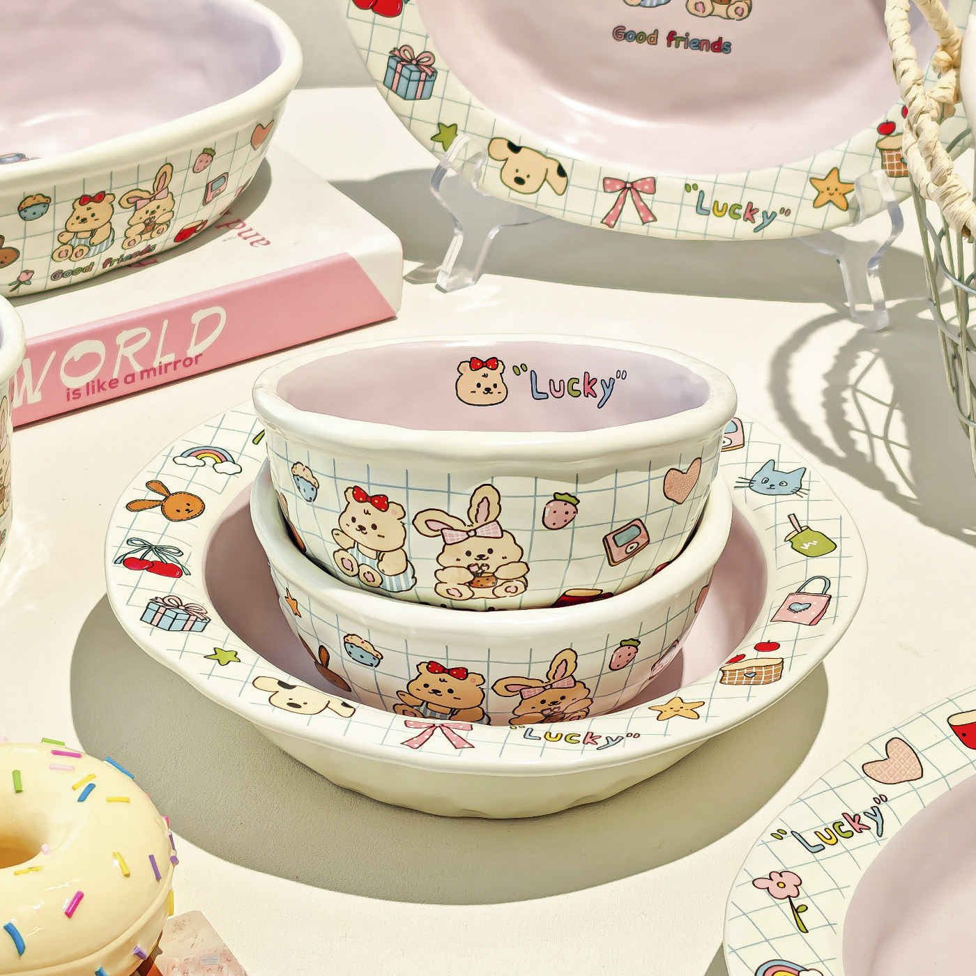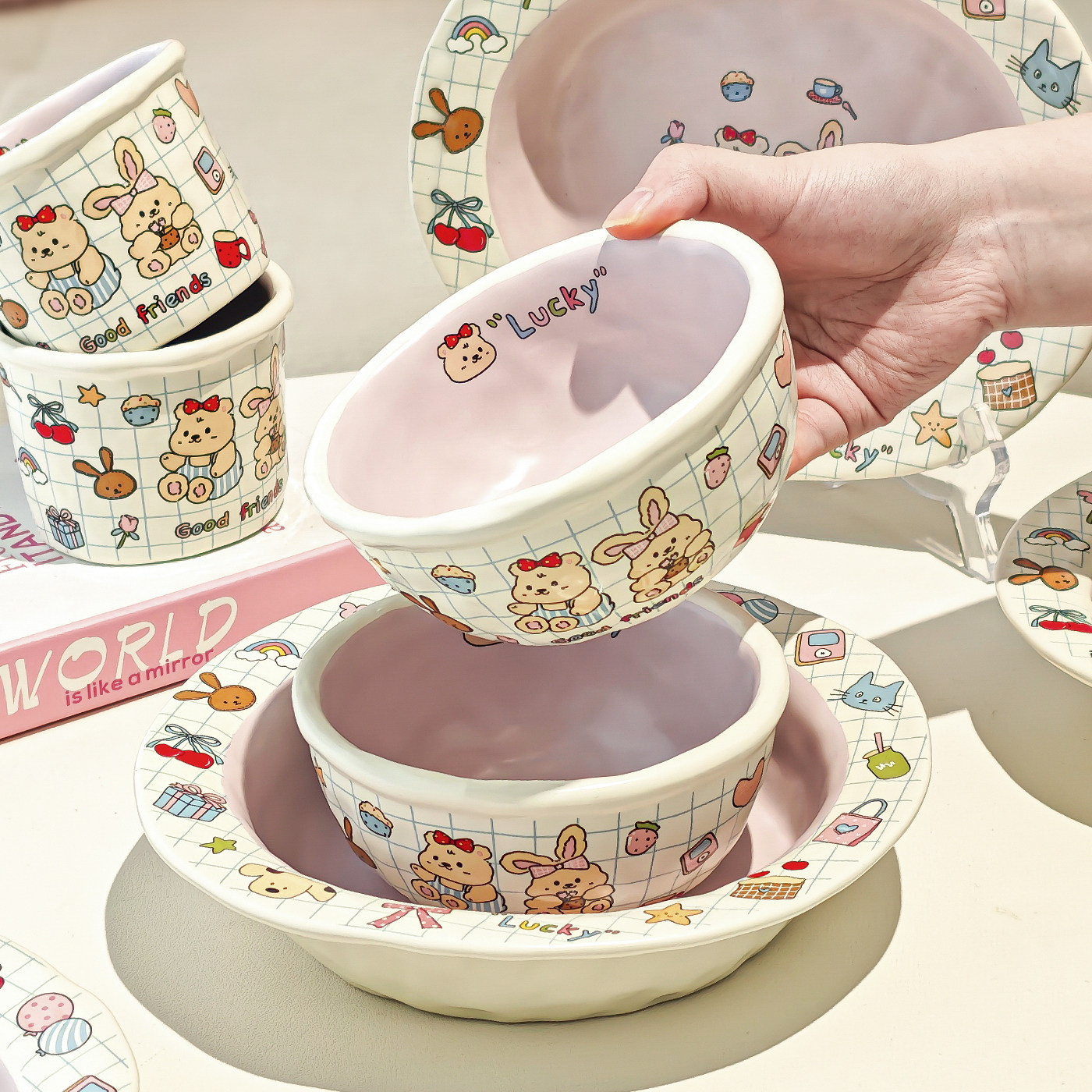 奶油风陶瓷碗家用卡通菜盘子可爱米饭碗汤碗釉下彩儿童餐具耐高温