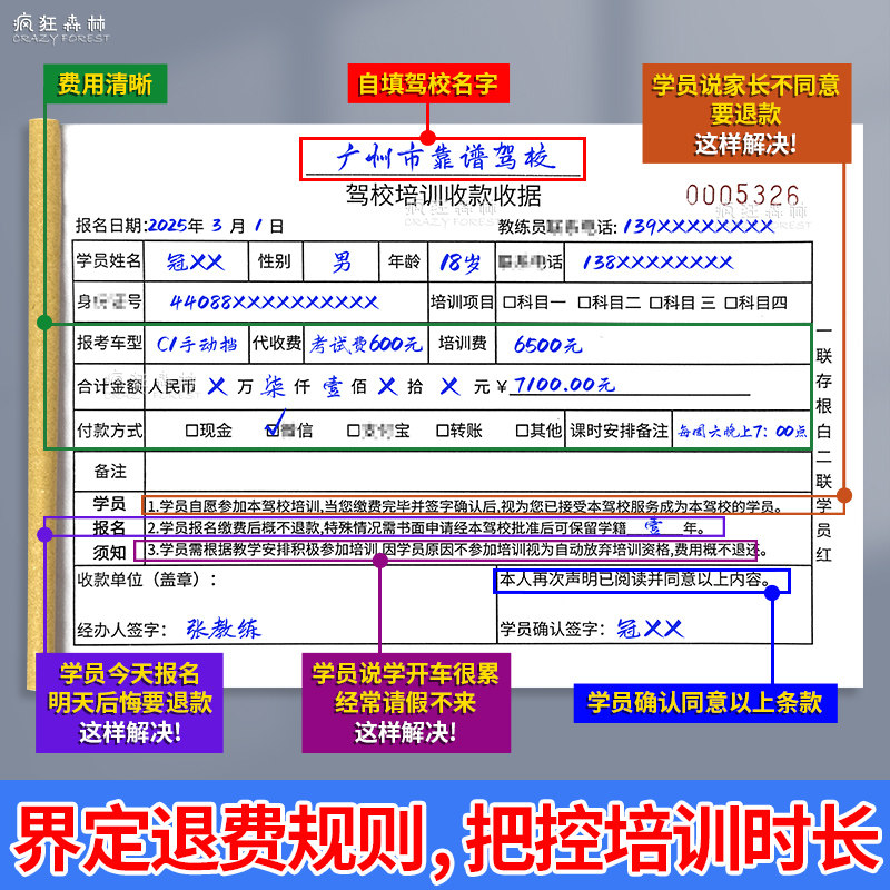 驾校培训收款收据通用驾驶学校正规收据教练收据学车学员报名收据驾校专用收据收费凭证驾校入学收费缴费收据
