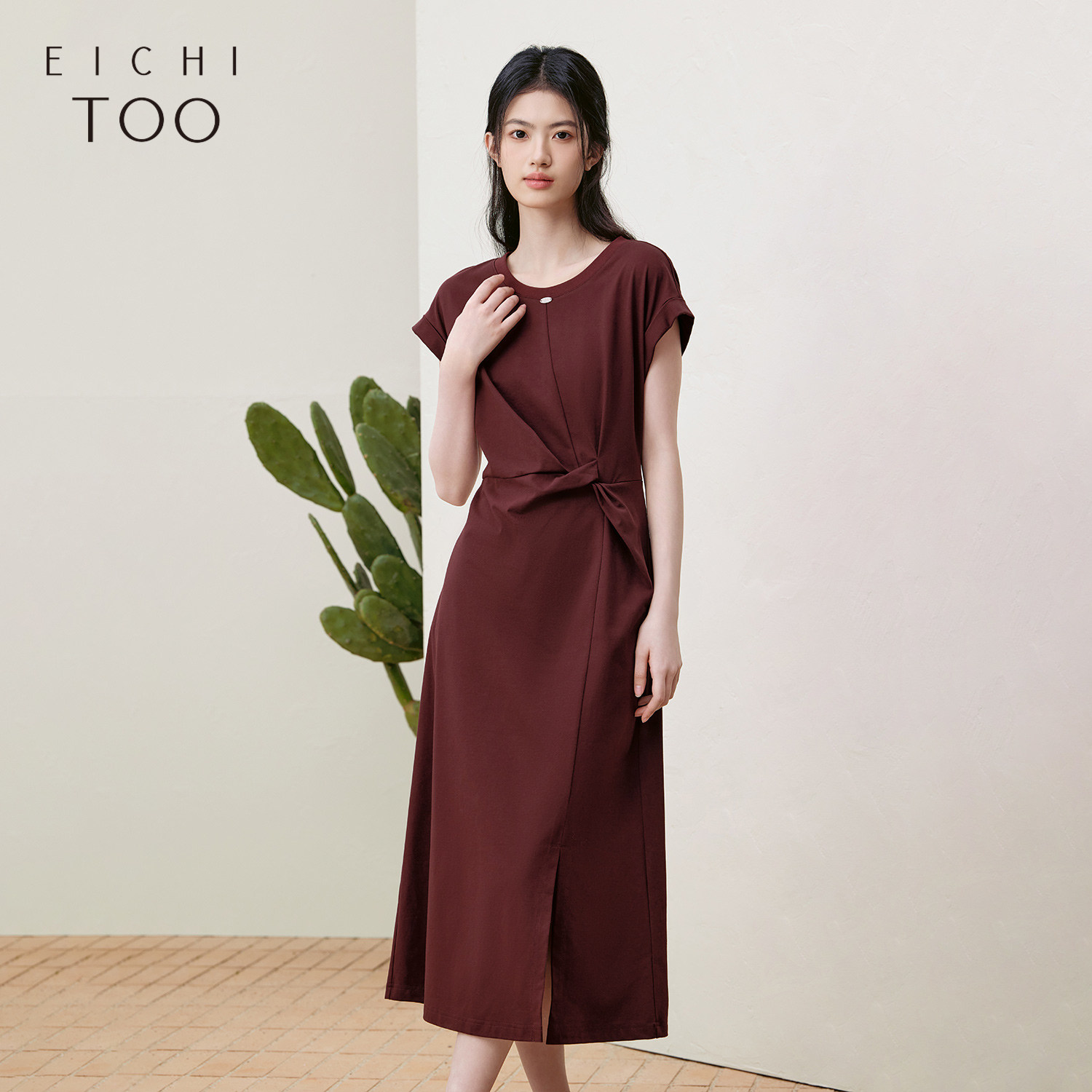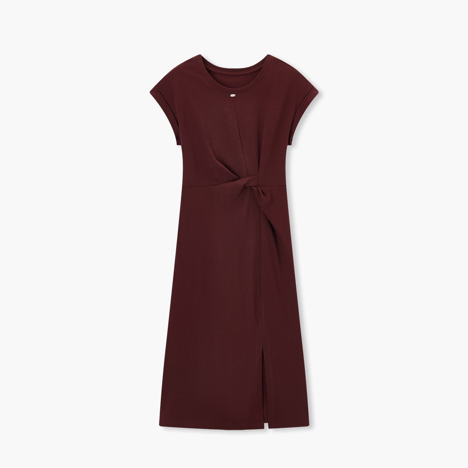 爱居兔安可拉红连衣裙女夏季新款收腰扭结短袖全棉T恤裙