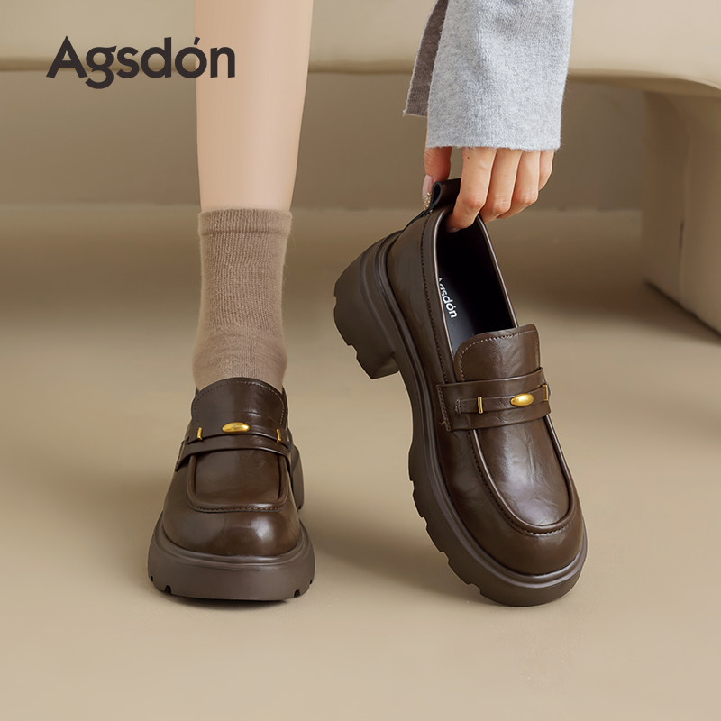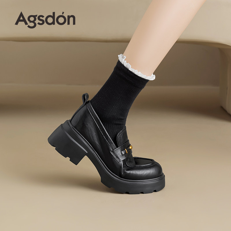 奥古狮登厚底乐福鞋女款2026新款春季英伦风黑色小皮鞋一脚蹬单鞋