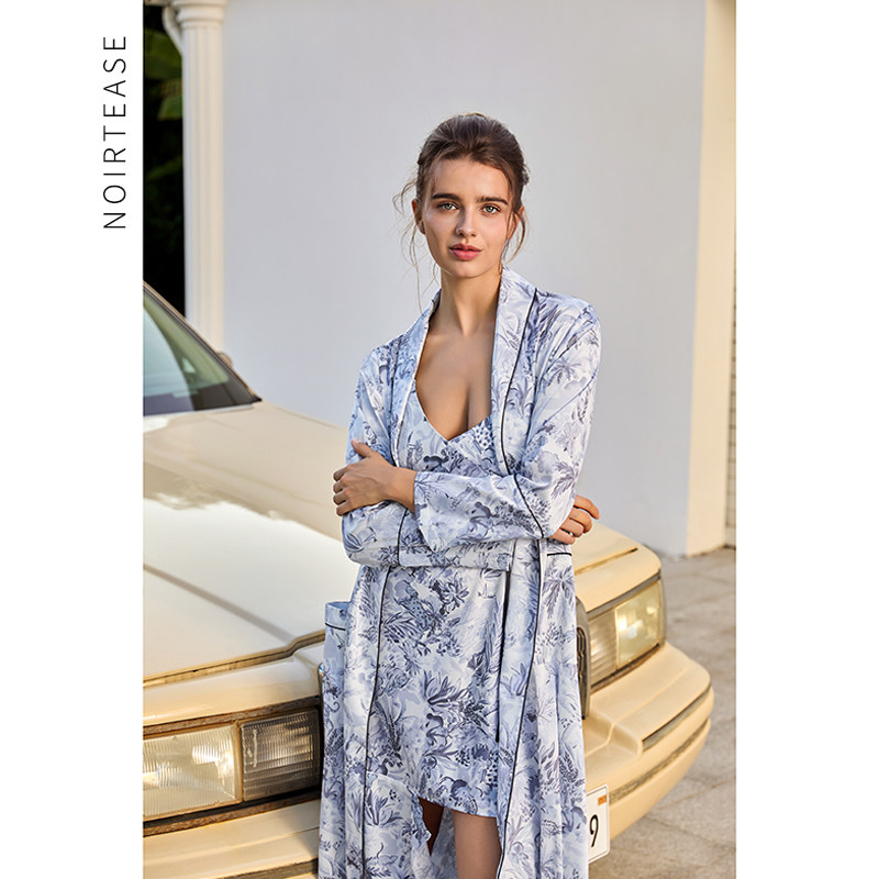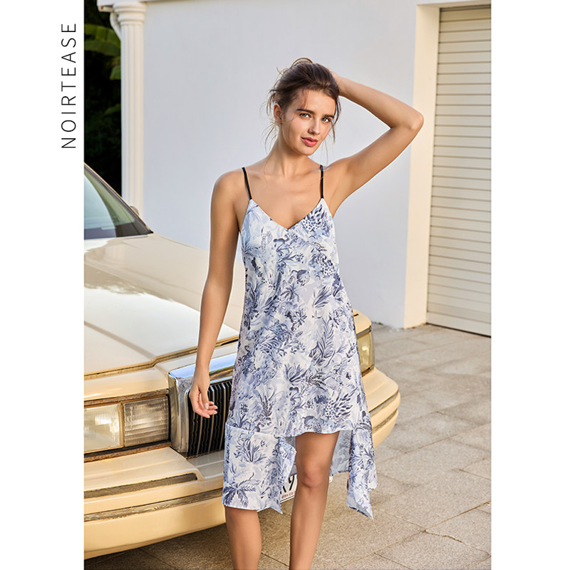 NoirTease夏季薄款性感丝质睡裙女士V领显瘦修身印花法式吊带睡衣
