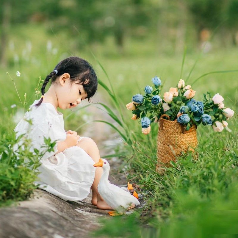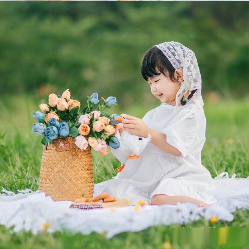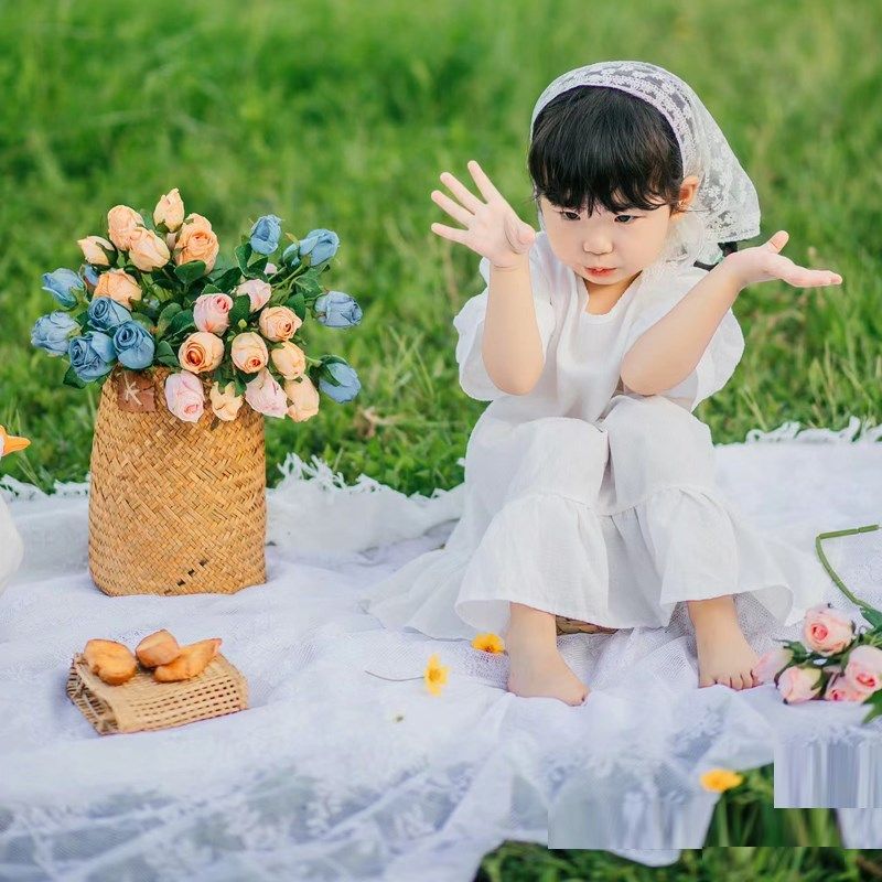 2024外景儿童拍照头饰蕾丝头巾周岁宝宝出游拍摄影道具草地花篮