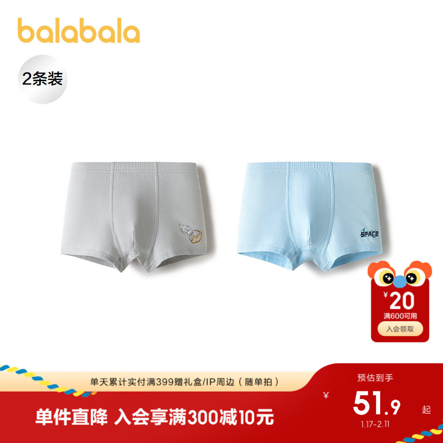 【商场同款】巴拉巴拉男童内裤平角儿童四角短裤大童不夹PP两条装