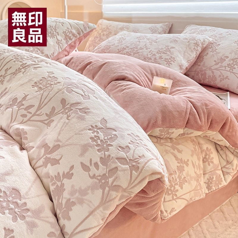 无印良品雕花牛奶绒四件套秋冬2025新款珊瑚绒床单被套床上三件套