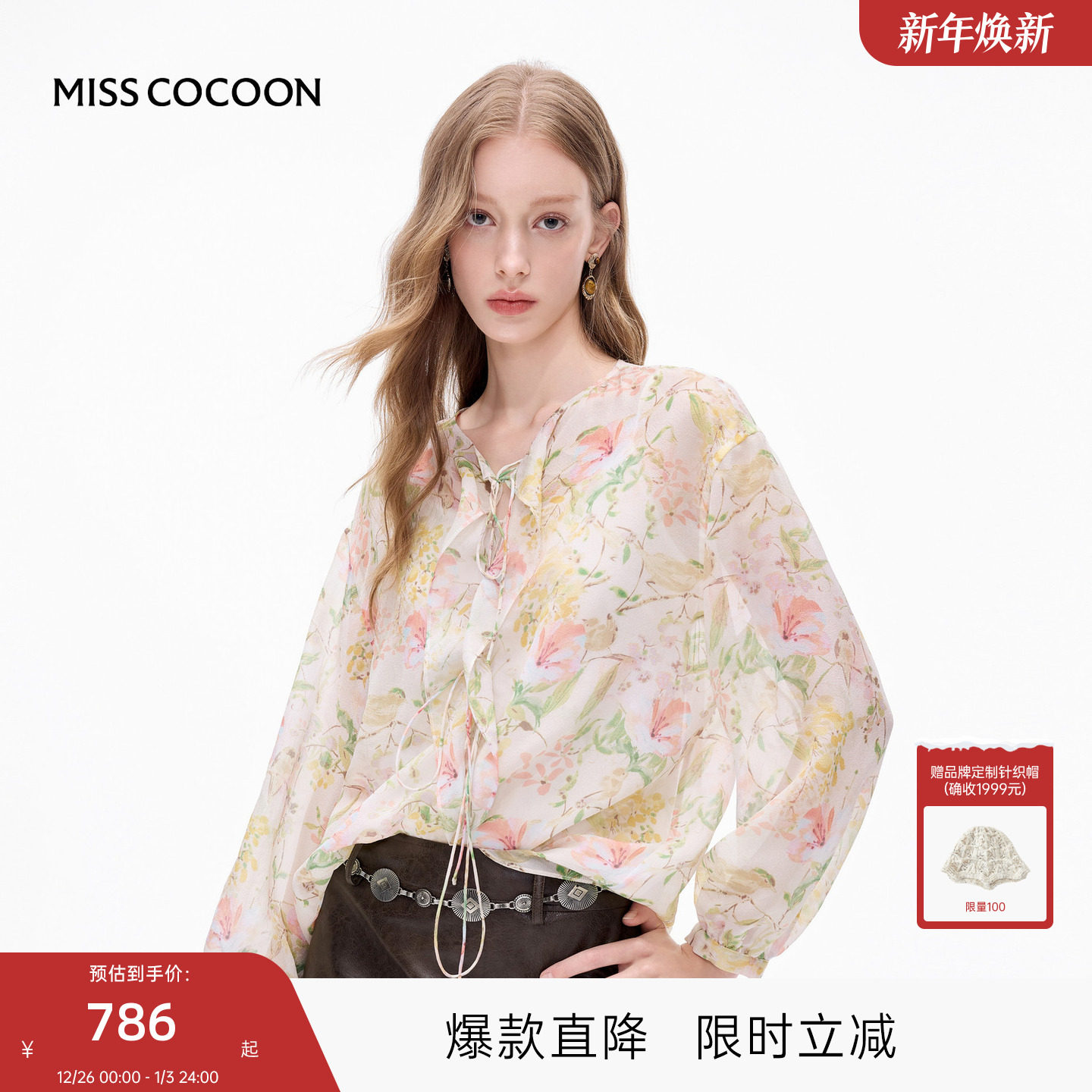 MISSCOCOON可可尼V领雪纺衫女2025秋季新款法式薄款印花长袖上衣
