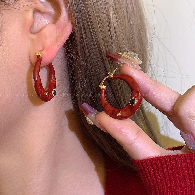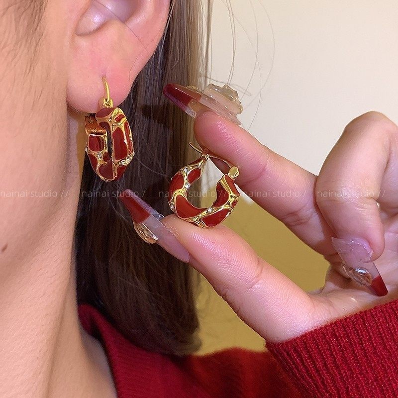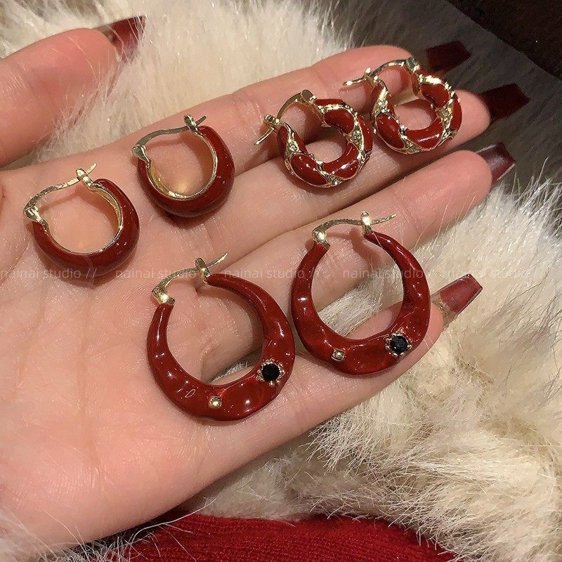 新年红色系耳环~高级感复古法式滴油小众圆圈耳圈耳钉港风耳饰潮