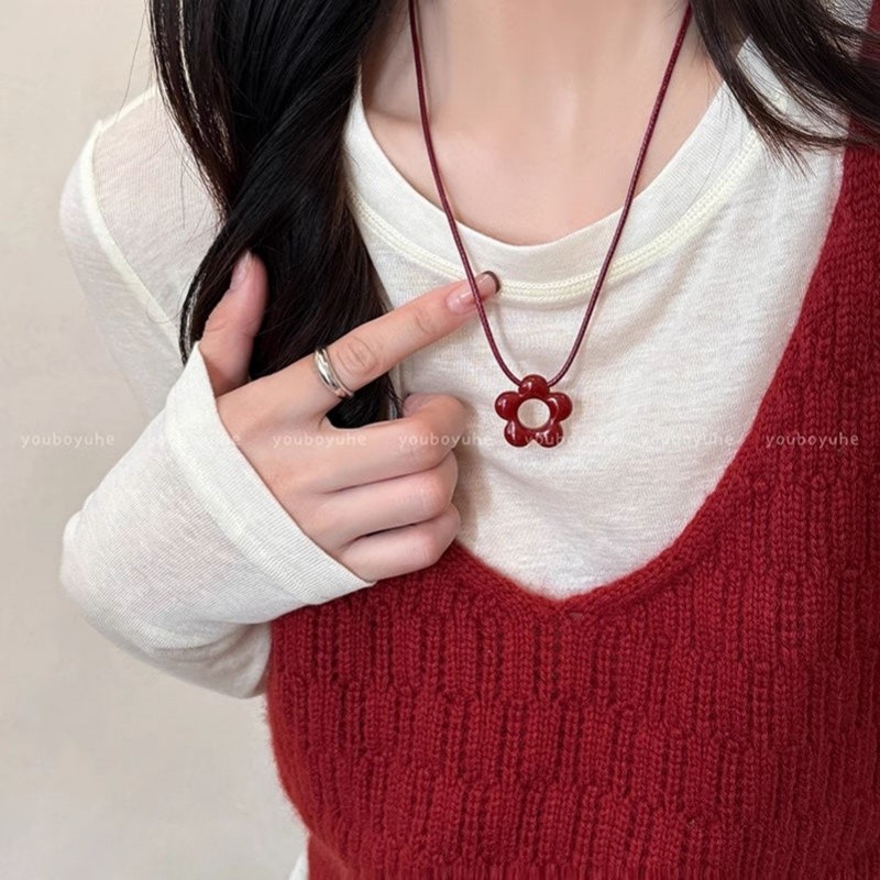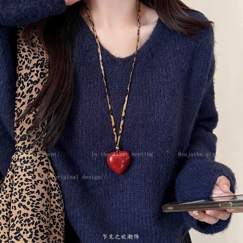红色镂空花朵爱心项链女秋冬2025新款韩系卫衣链时尚高级感毛衣链