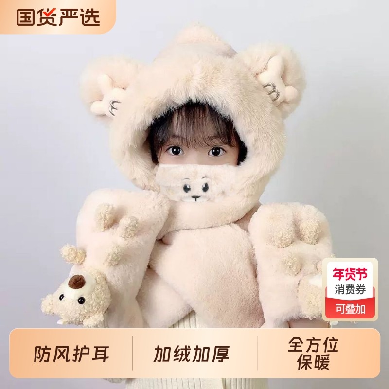 尼多熊儿童帽子围巾一体冬季防风帽宝宝毛绒护耳帽女童加厚保暖帽