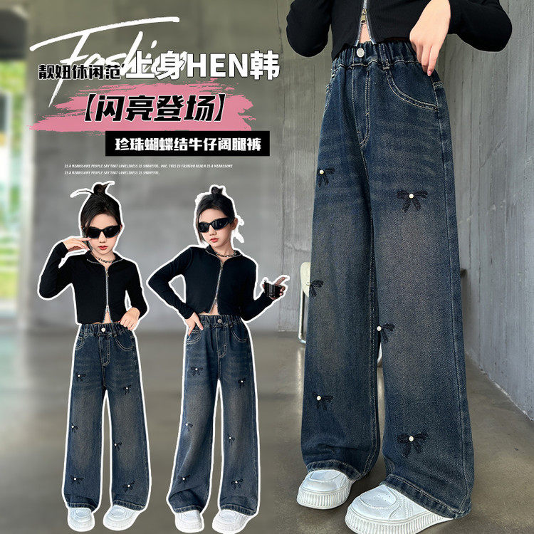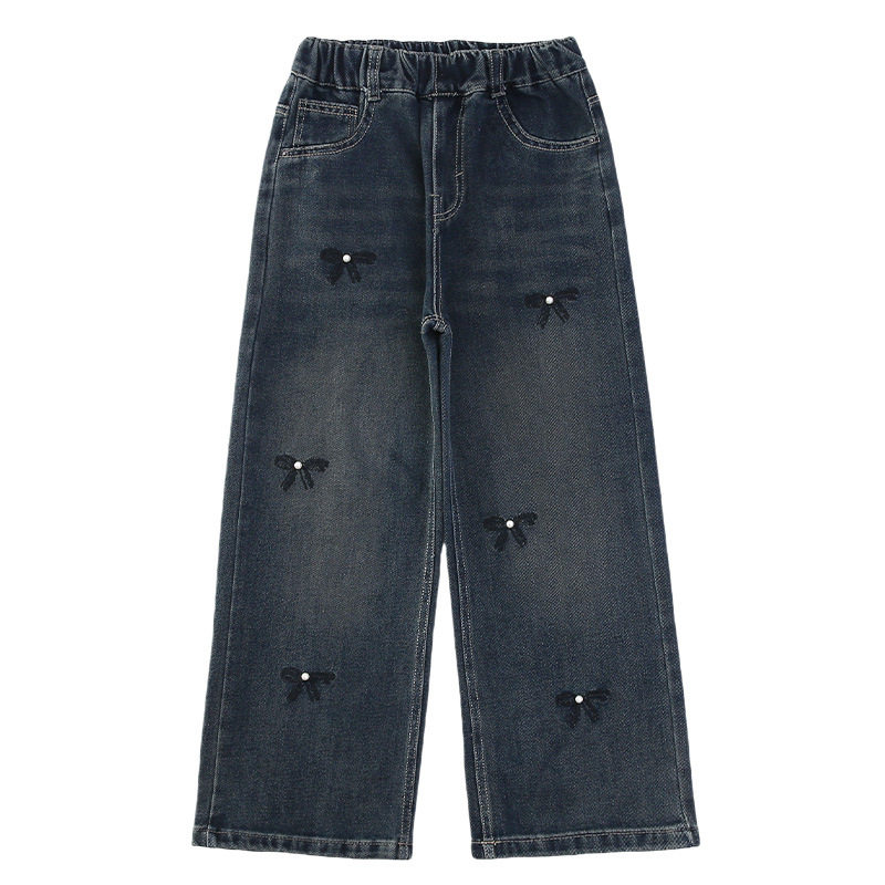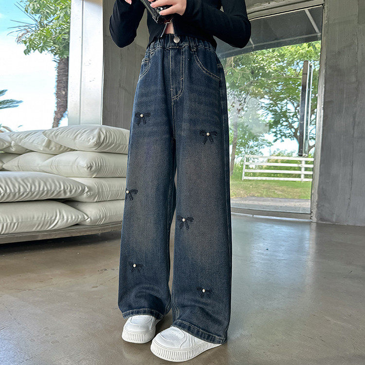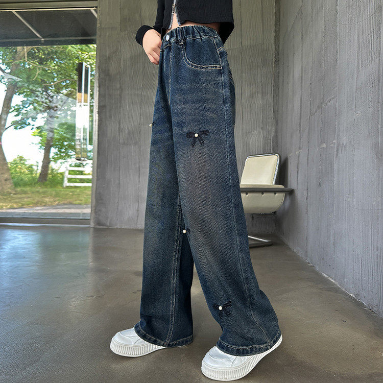 大童春秋牛仔裤初中生宽松蝴蝶结阔腿裤直筒女孩裤子童装下装A48