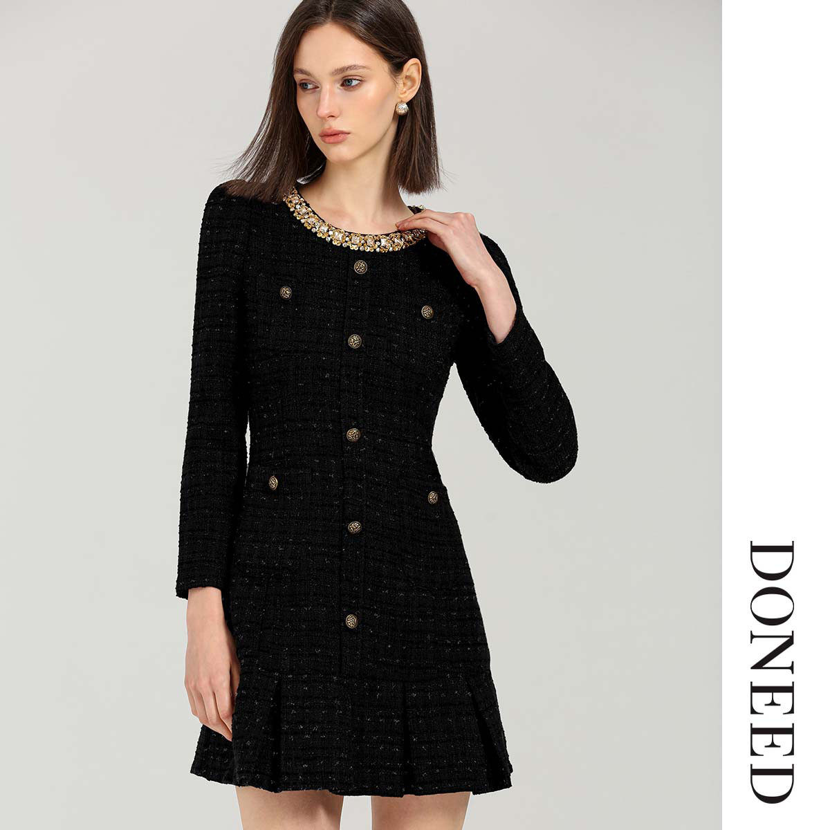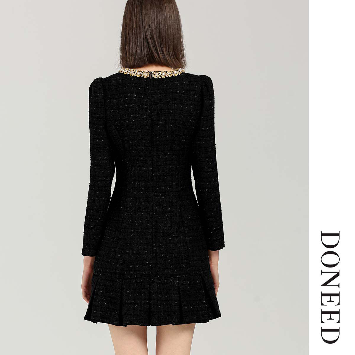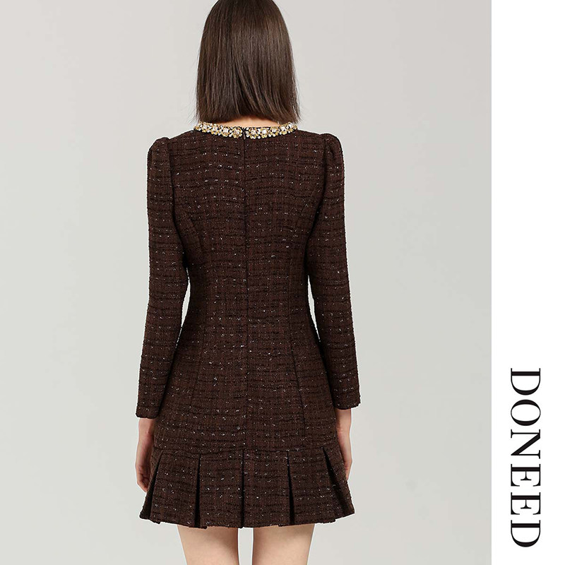 DONEED春款时尚优雅气质小香风重工钉珠圆领设计感修身连衣裙女