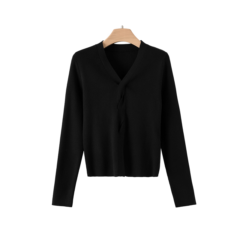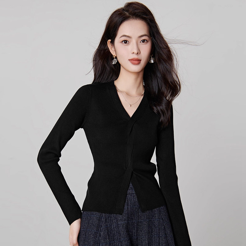 晚白2025秋新款V领巨好看上衣设计感黑套头毛针织衫女毛衣