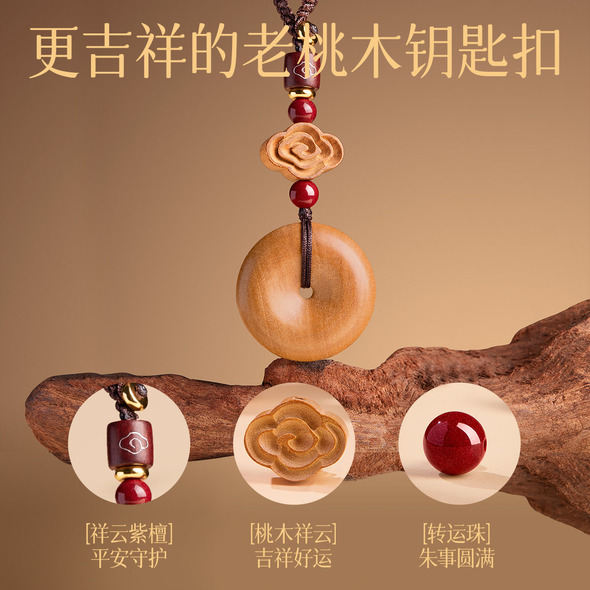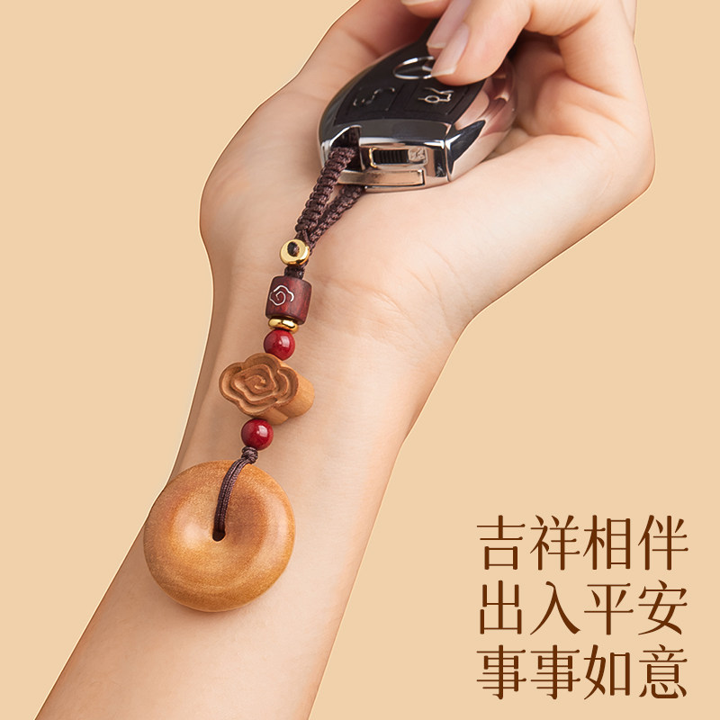 庆祥泰真正天然桃木平安扣挂件正品官方旗舰女士随身朱砂木质手机吊坠钥匙扣男汽车挂饰品2026一路平安护身符