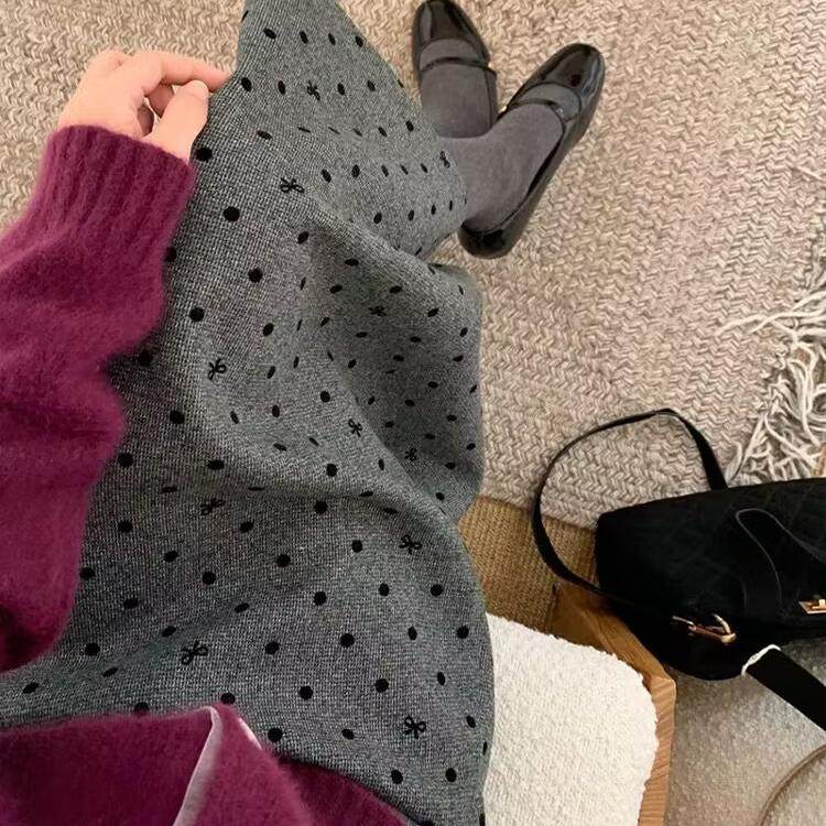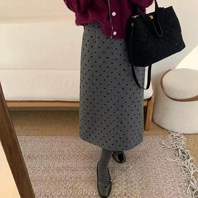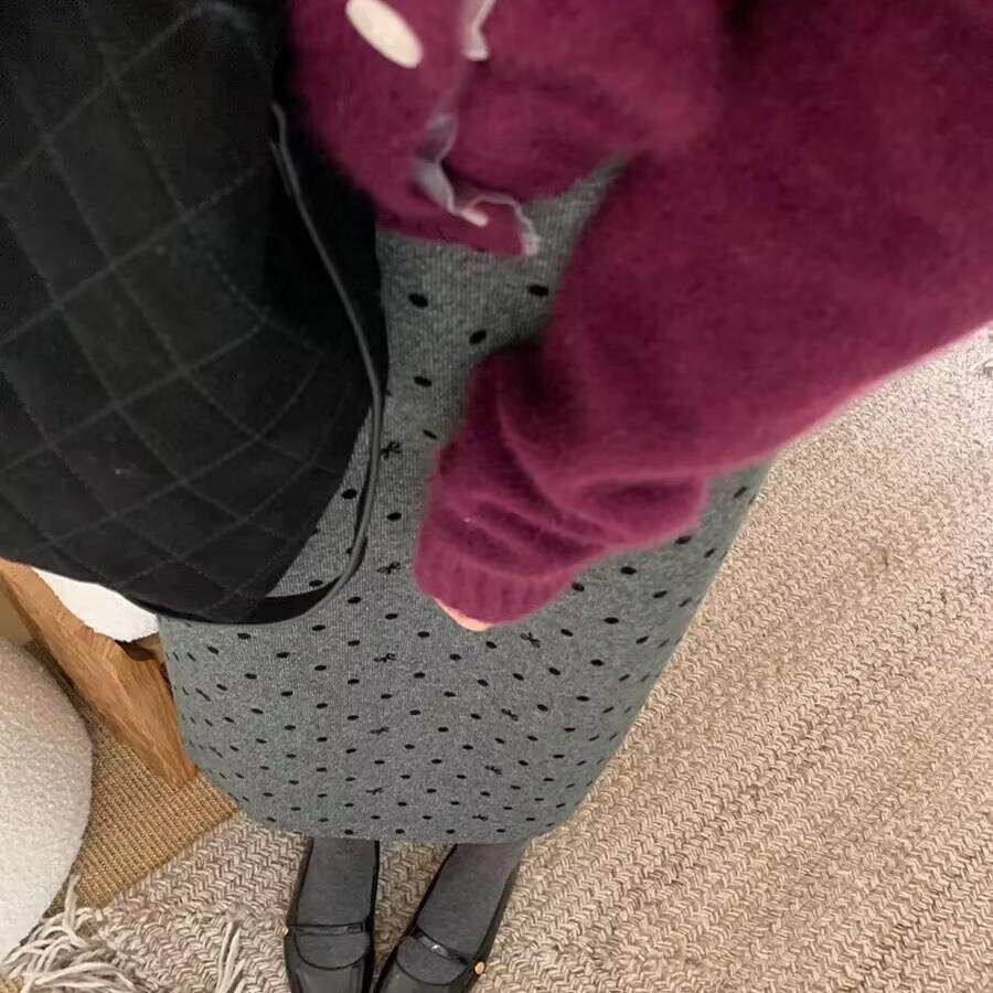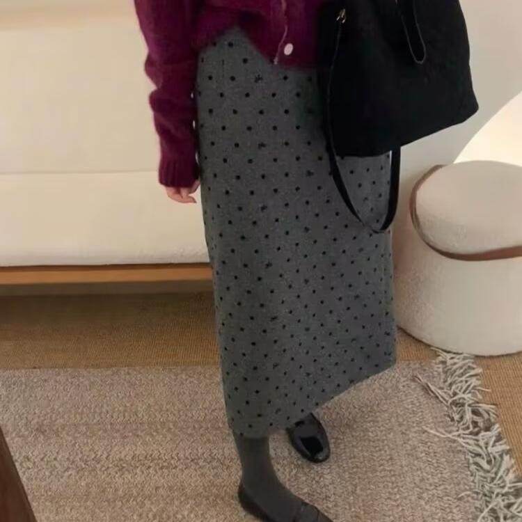 大码灰色波点毛呢半身裙女秋冬高腰显瘦后开叉直筒裙中长款a字裙