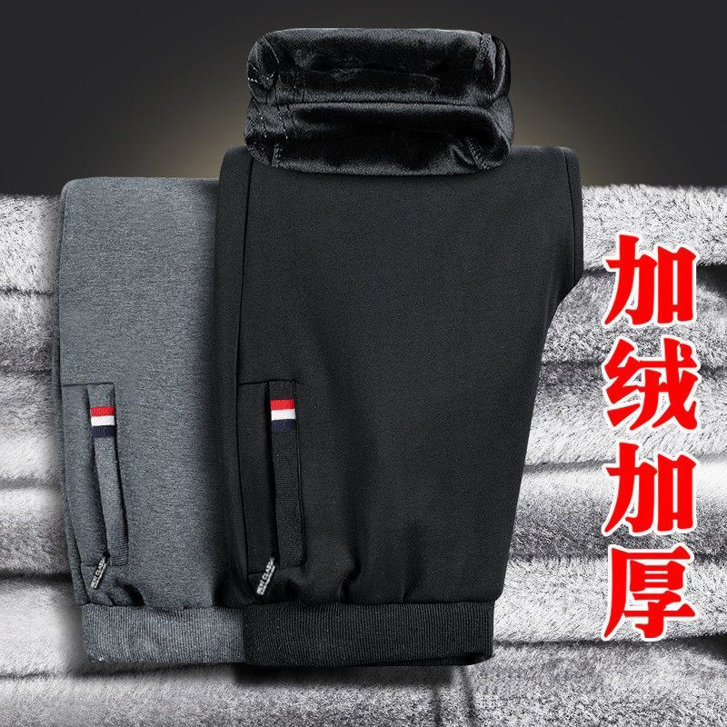 秋冬季加绒加厚休闲裤子男冬天保暖束脚长裤男士黑色直筒运动裤