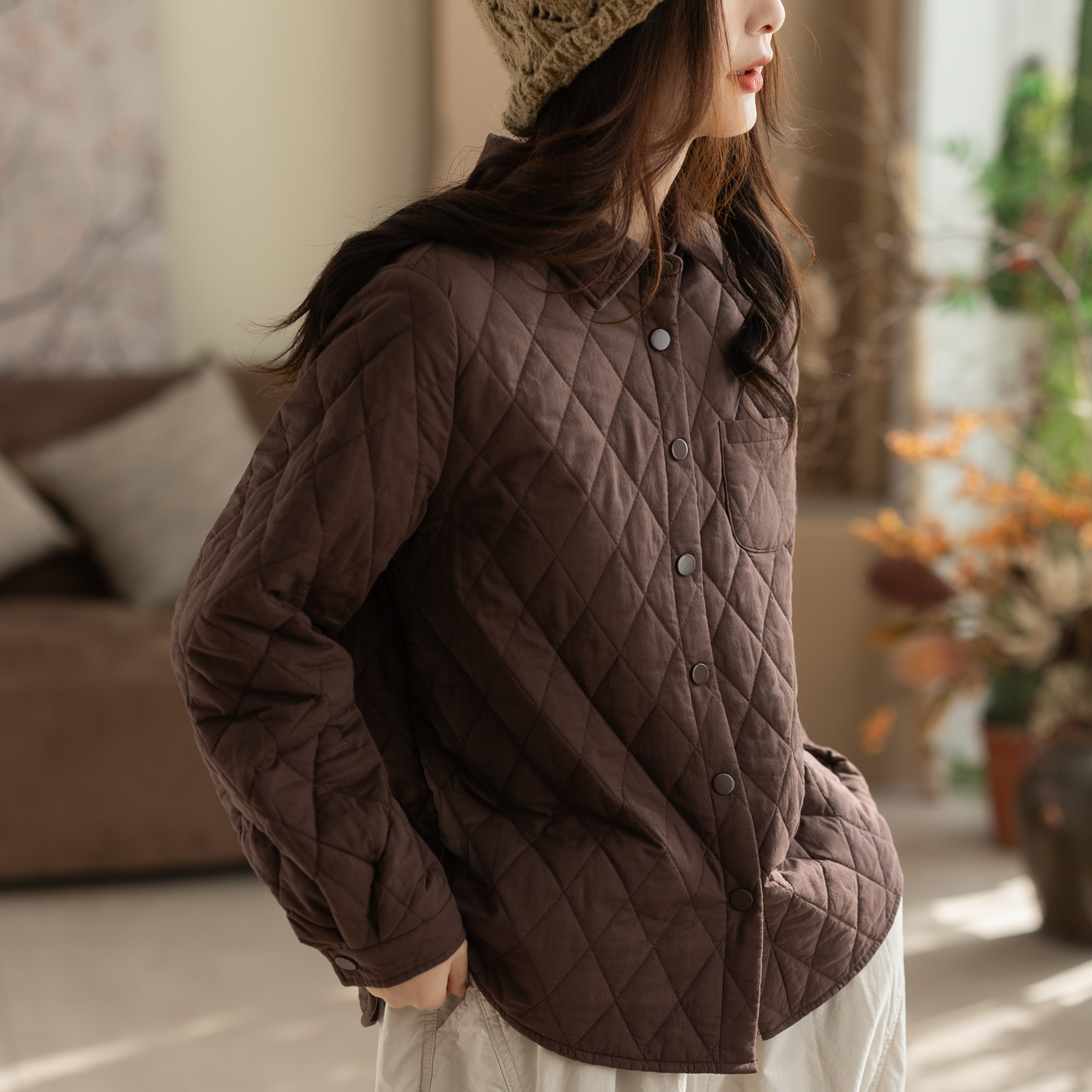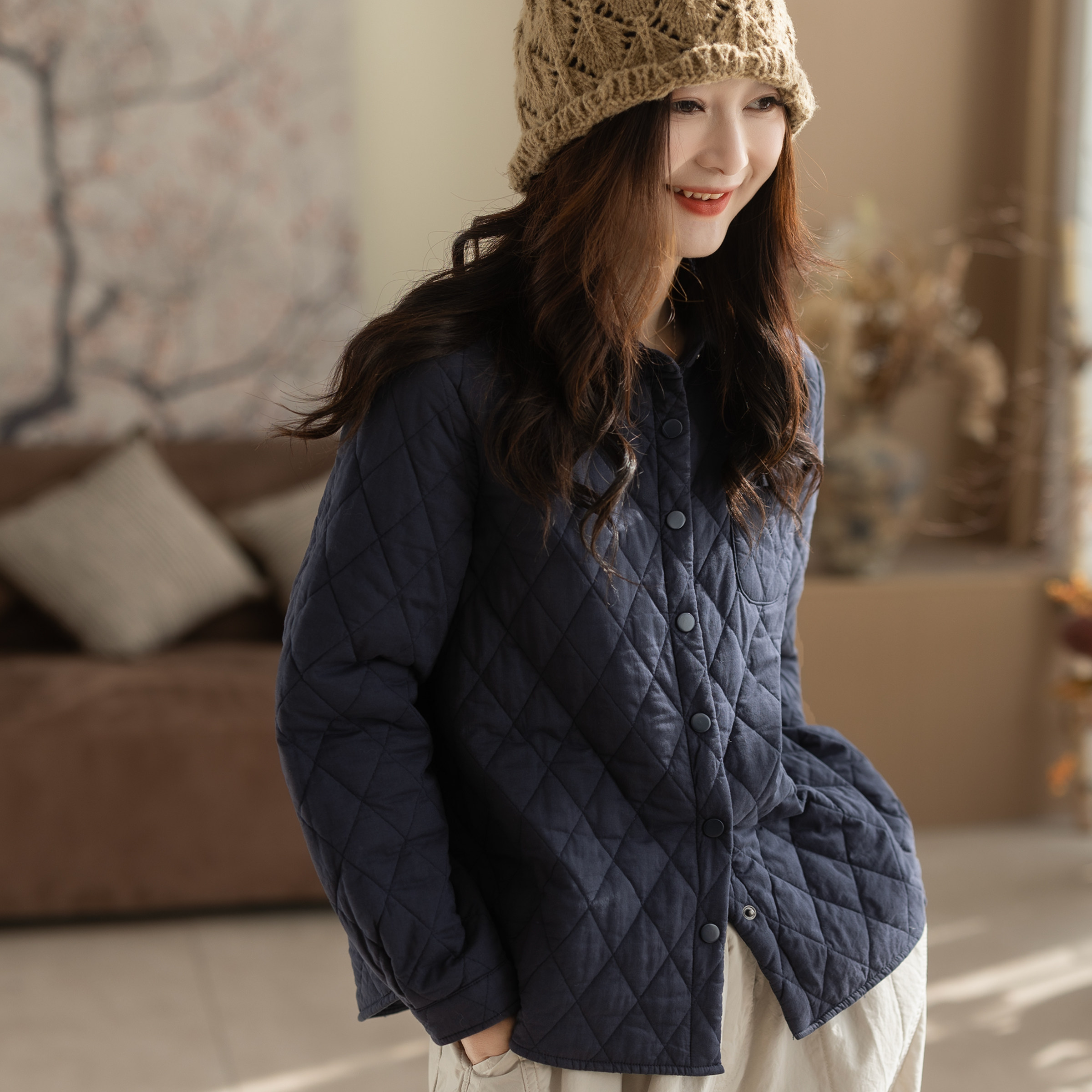 咖咪羽100%棉冬季新款文艺休闲菱形格百搭复古简约流行女装棉服女