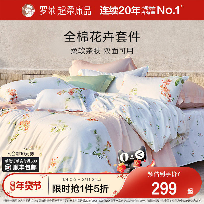罗莱家纺2025新款全棉纯棉三件套床单被套被罩床上用品四件套