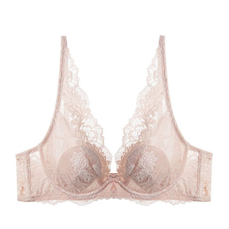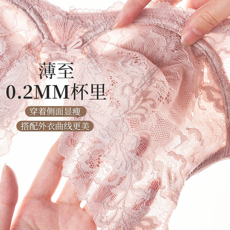润微茶肌内衣女士大胸显小薄款收副乳聚拢大码上托防下垂蕾丝文胸