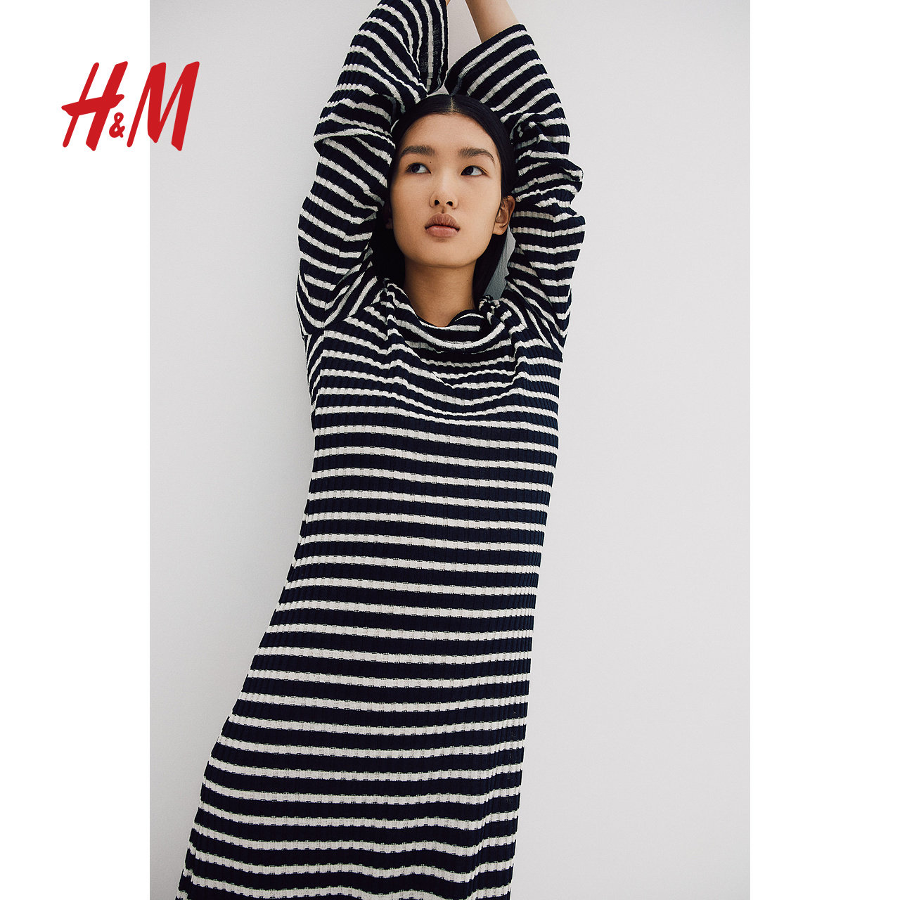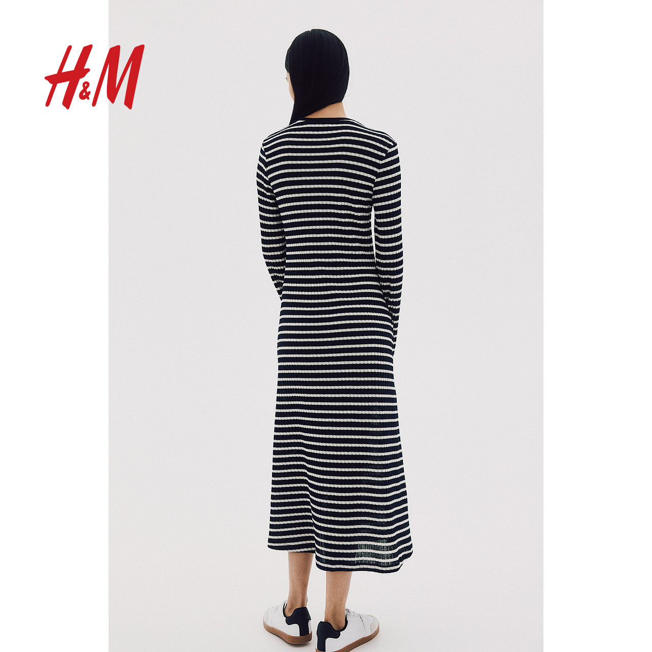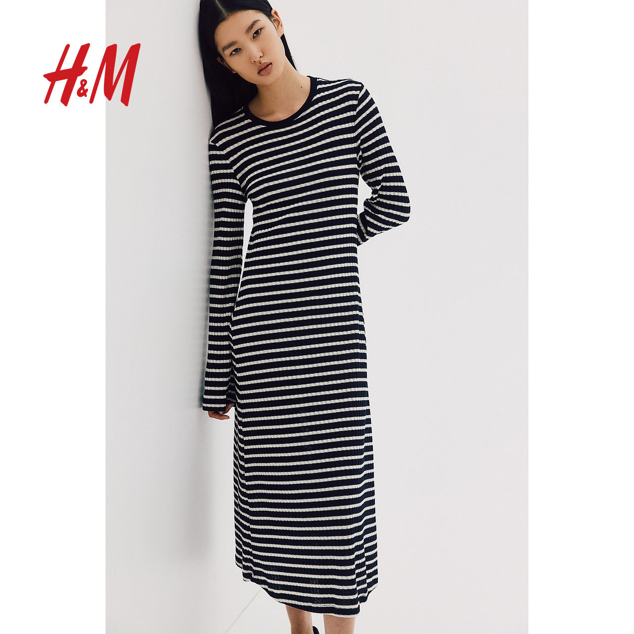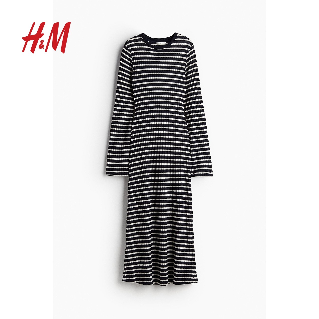 HM女装连衣裙冬季修身休闲条纹圆领长袖中长裙1240140