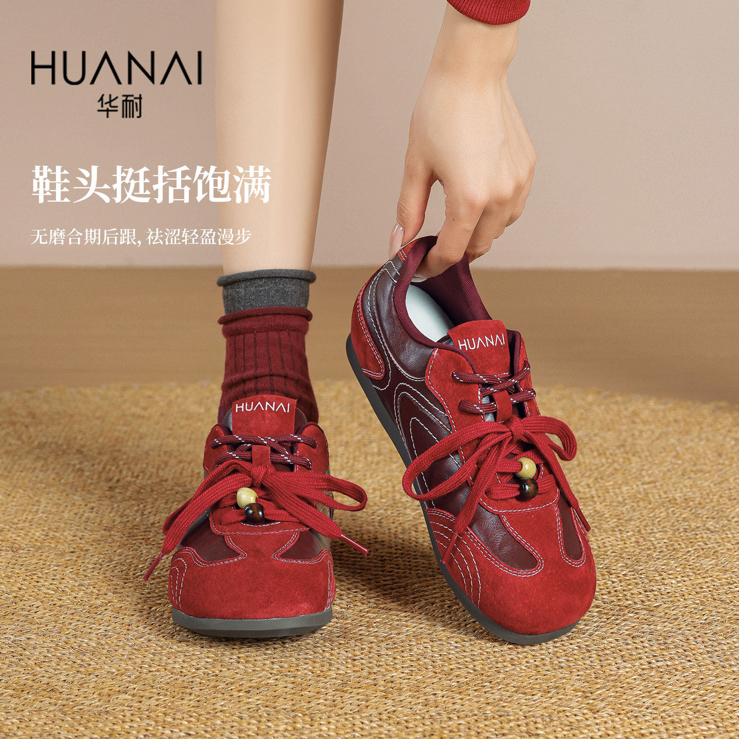 戈美其商场同款芭蕾德训鞋女2025冬季新款双鞋带加绒红色鞋子板鞋