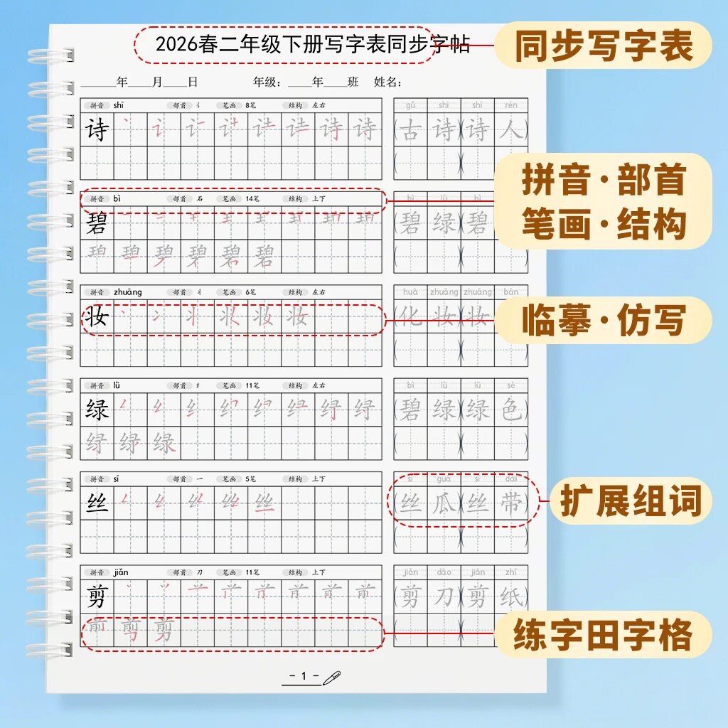 2026春人教版二年级下册组词写字表笔画拼音部首同步练字帖二三年
