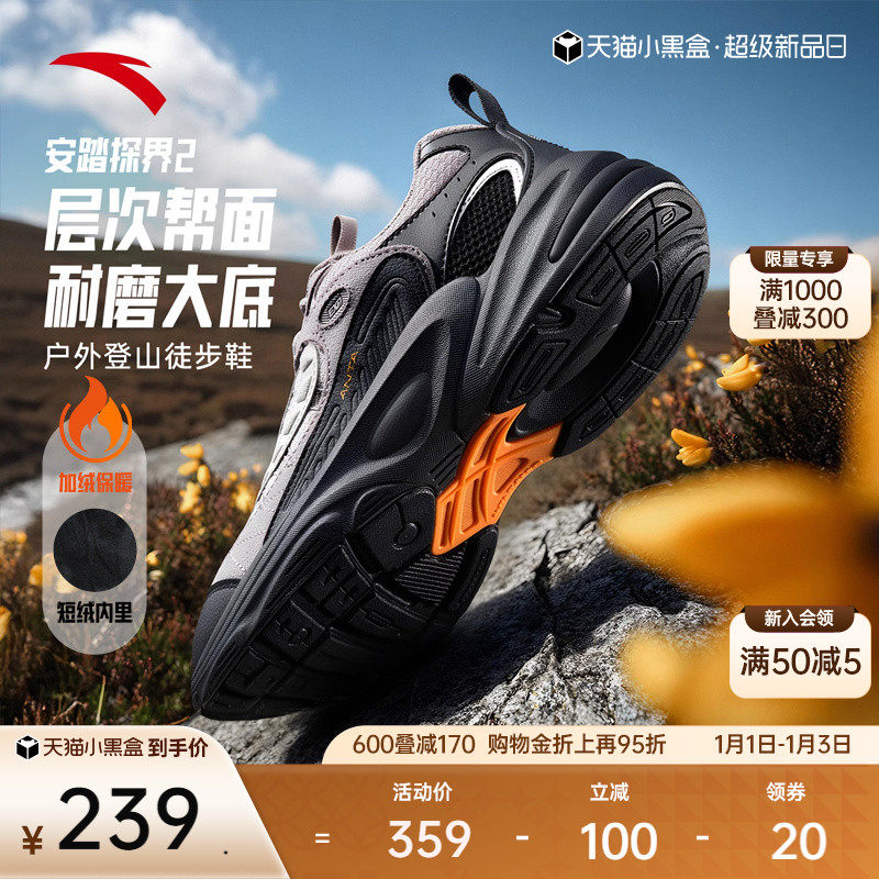 安踏探界2丨抓地户外加绒徒步鞋男冬季耐磨登山越野运动鞋子男鞋