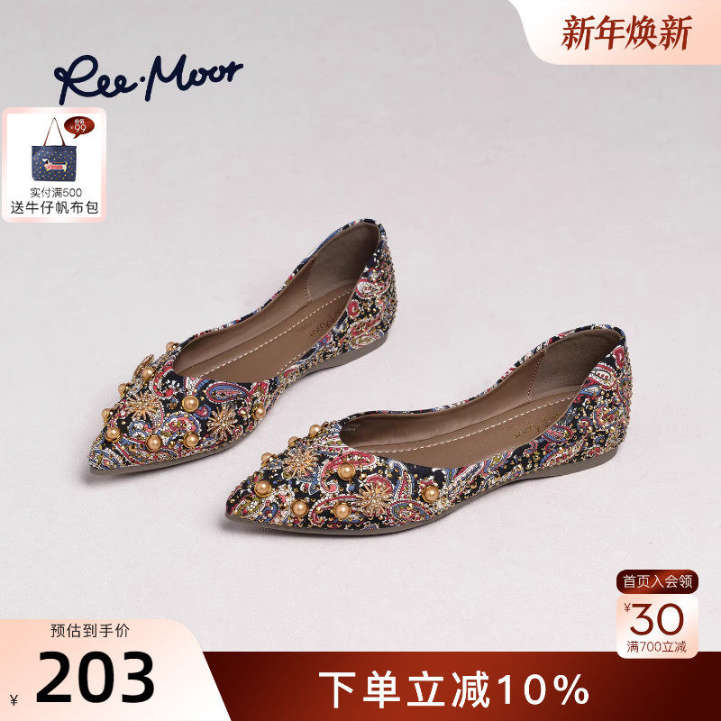 REEMOOR睿慕2025秋新款民族风尖头单鞋平底浅口水钻软底舒适女鞋