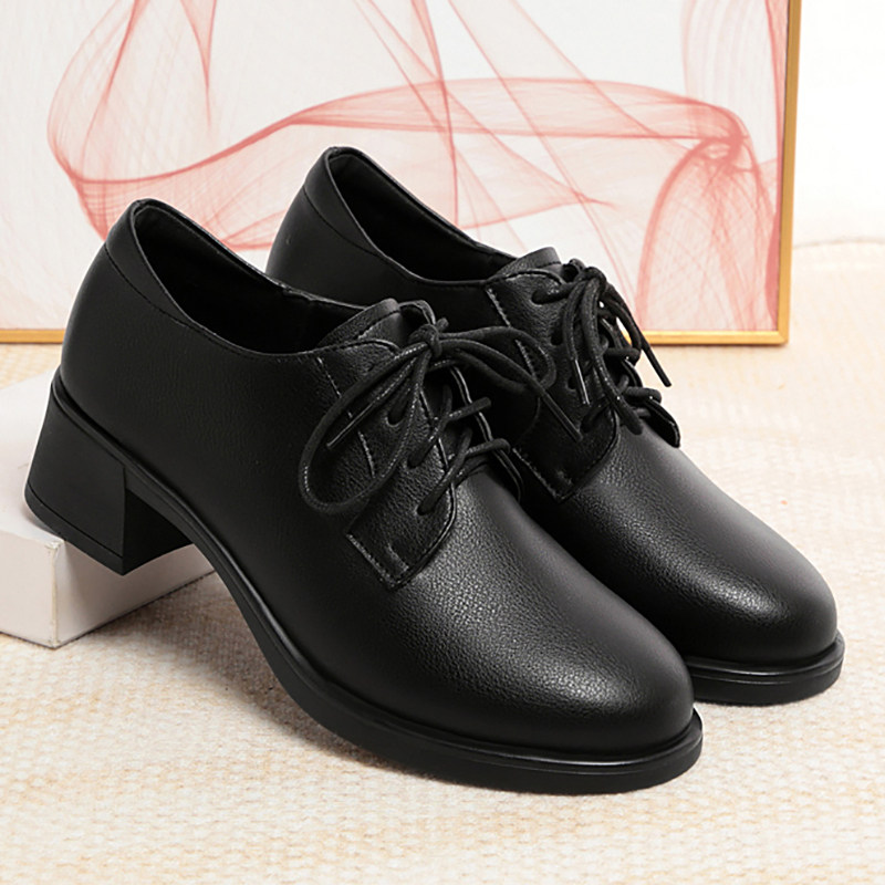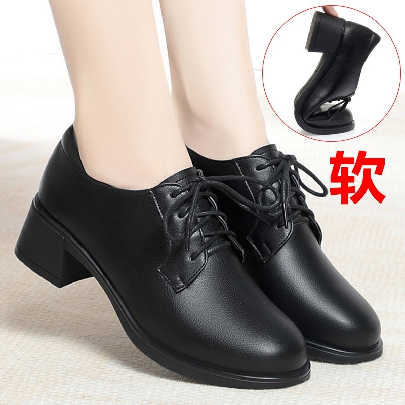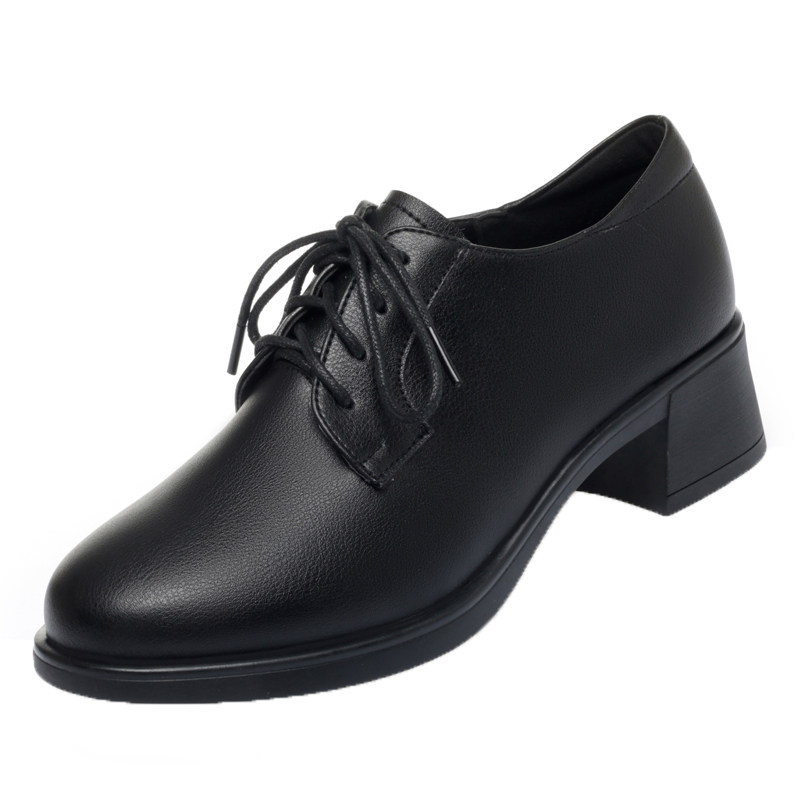 他她女孩秋冬真皮软底深口系带工作鞋女黑色工装通勤上班女士皮鞋