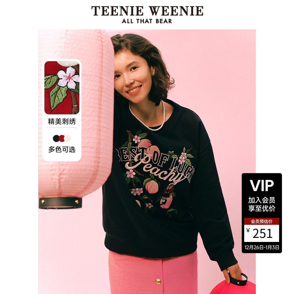 TeenieWeenie小熊奥莱女装秋冬桃运满满红色圆领学院宽松卫衣上衣
