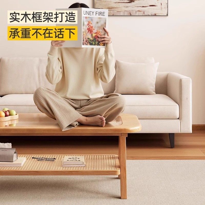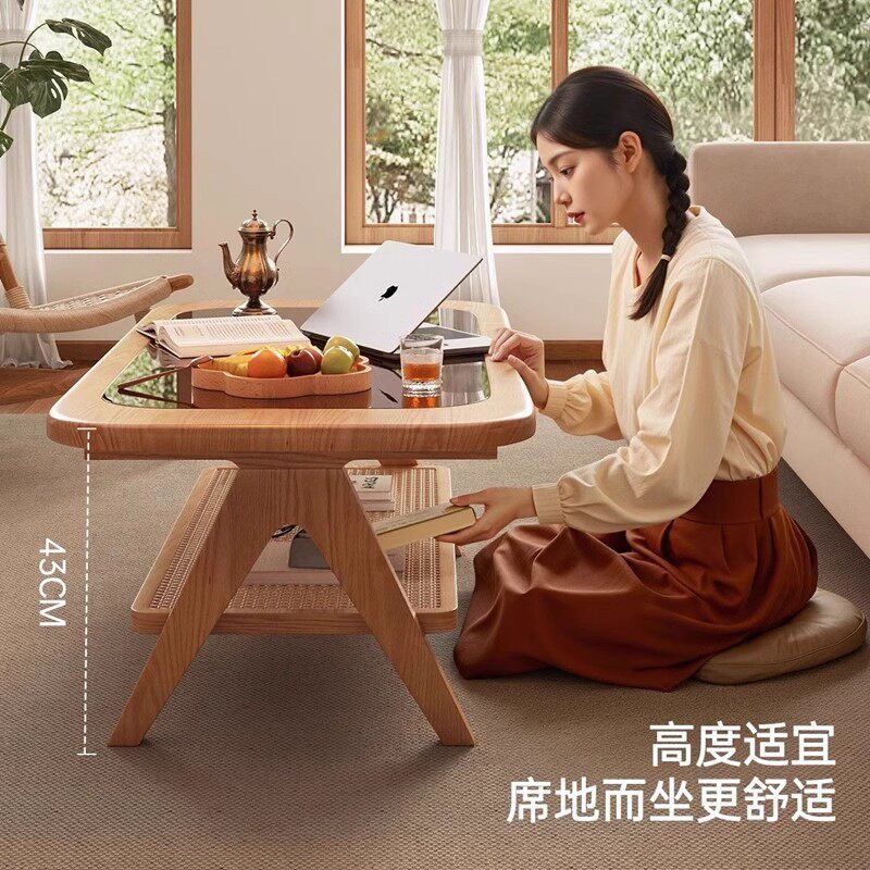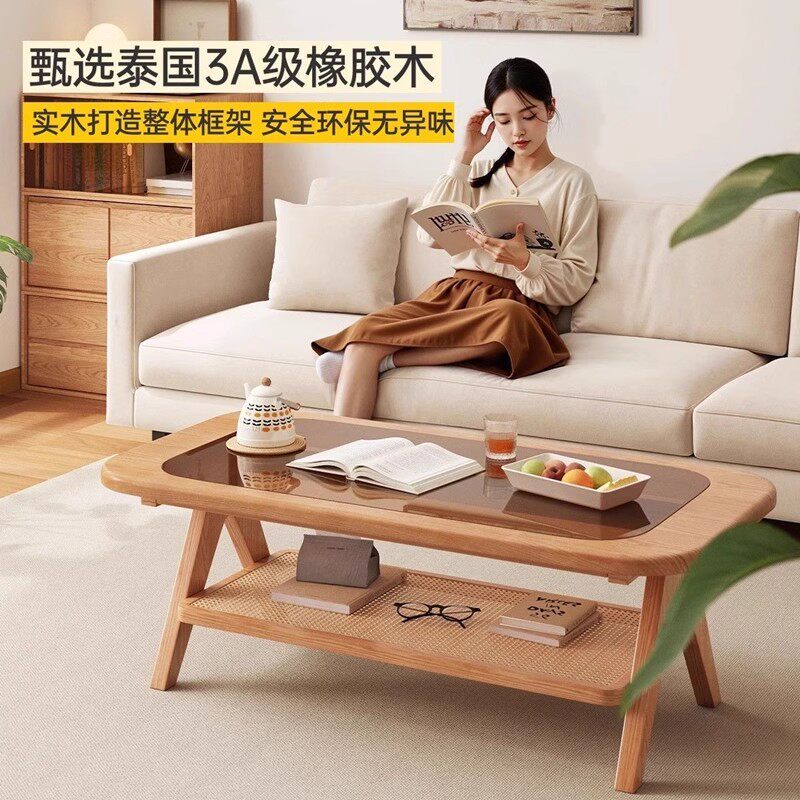 实木茶几客厅家用2025新款高级感桌子玻璃日式双层茶桌简易藤编
