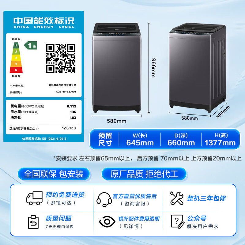 海尔洗衣机全自动家用波轮12公斤变频一级官方正品XQB120-BZ20D1