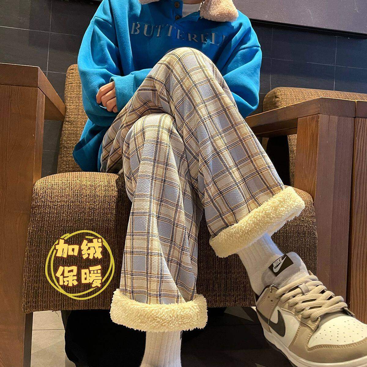 XW2 羊羔绒加绒加厚格子裤休闲裤女秋冬宽松直筒阔腿裤