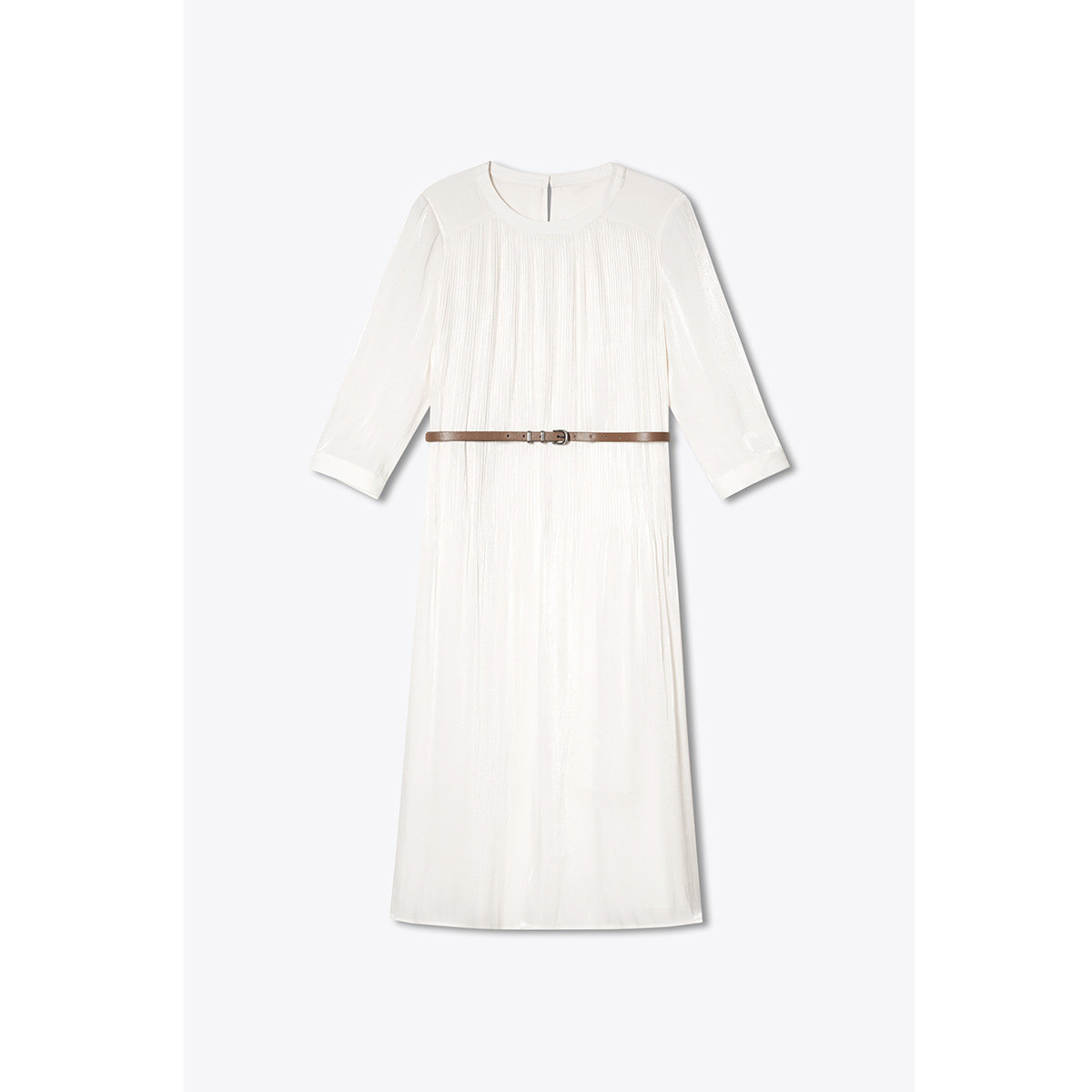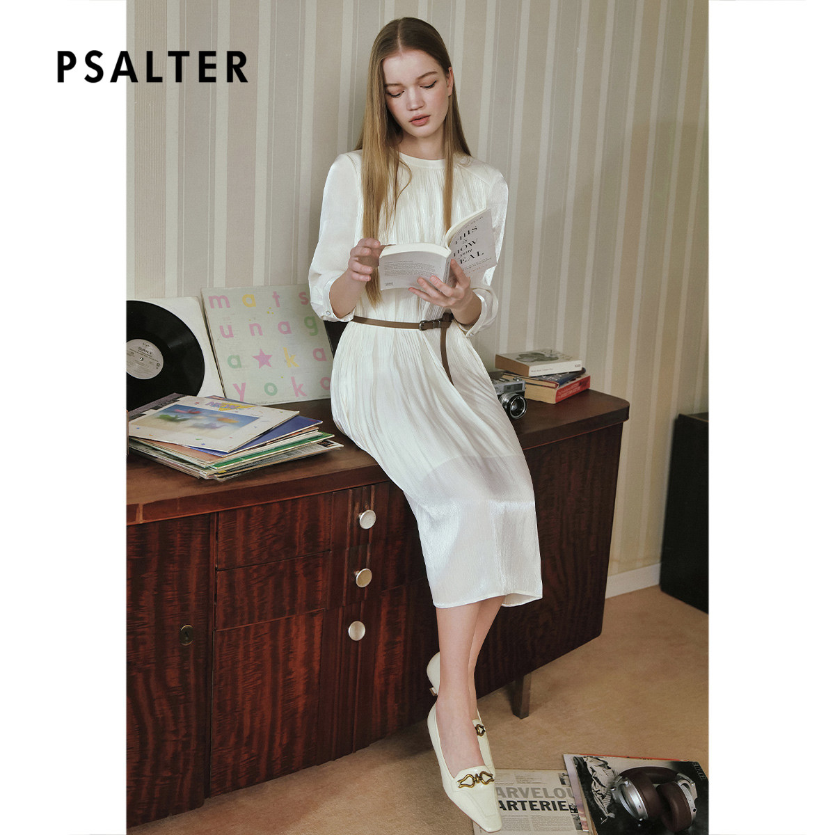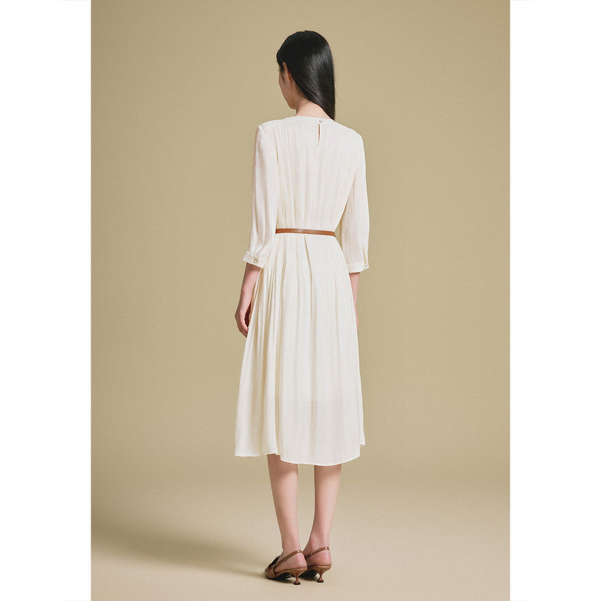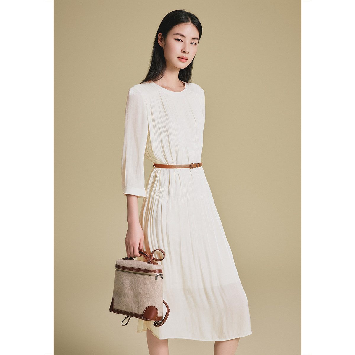 诗篇专选艺术感不规则压褶撞色皮带七分袖修身连衣裙2025春季新款