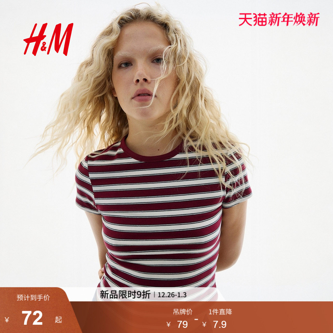 HM女装T恤2025新款酒红色时尚简约打底内搭修身棉质T恤1296040