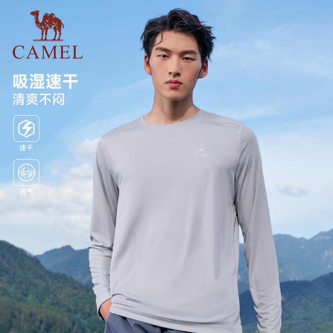 骆驼运动速干长袖T恤女2025夏季新款户外运动轻薄徒步内搭上衣男