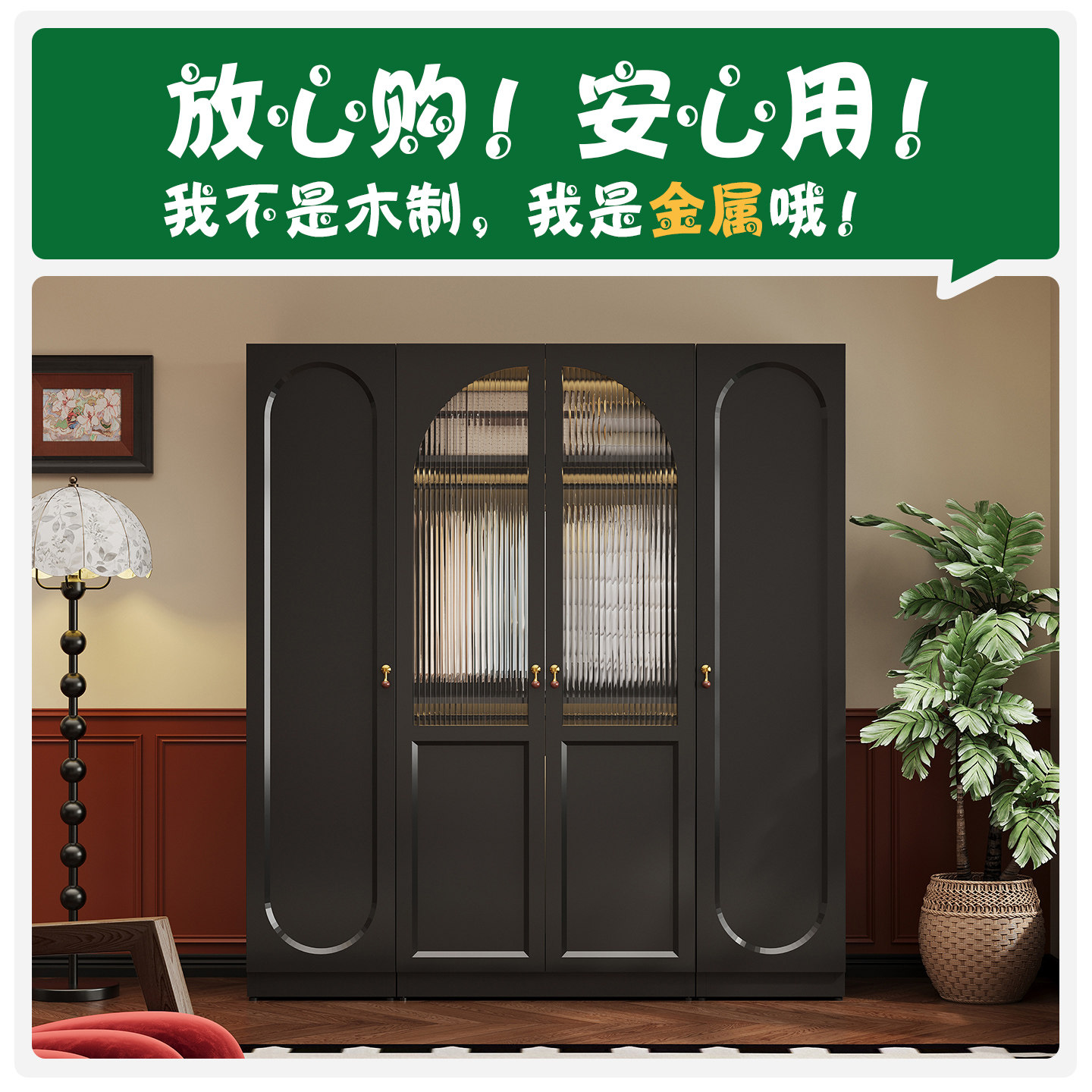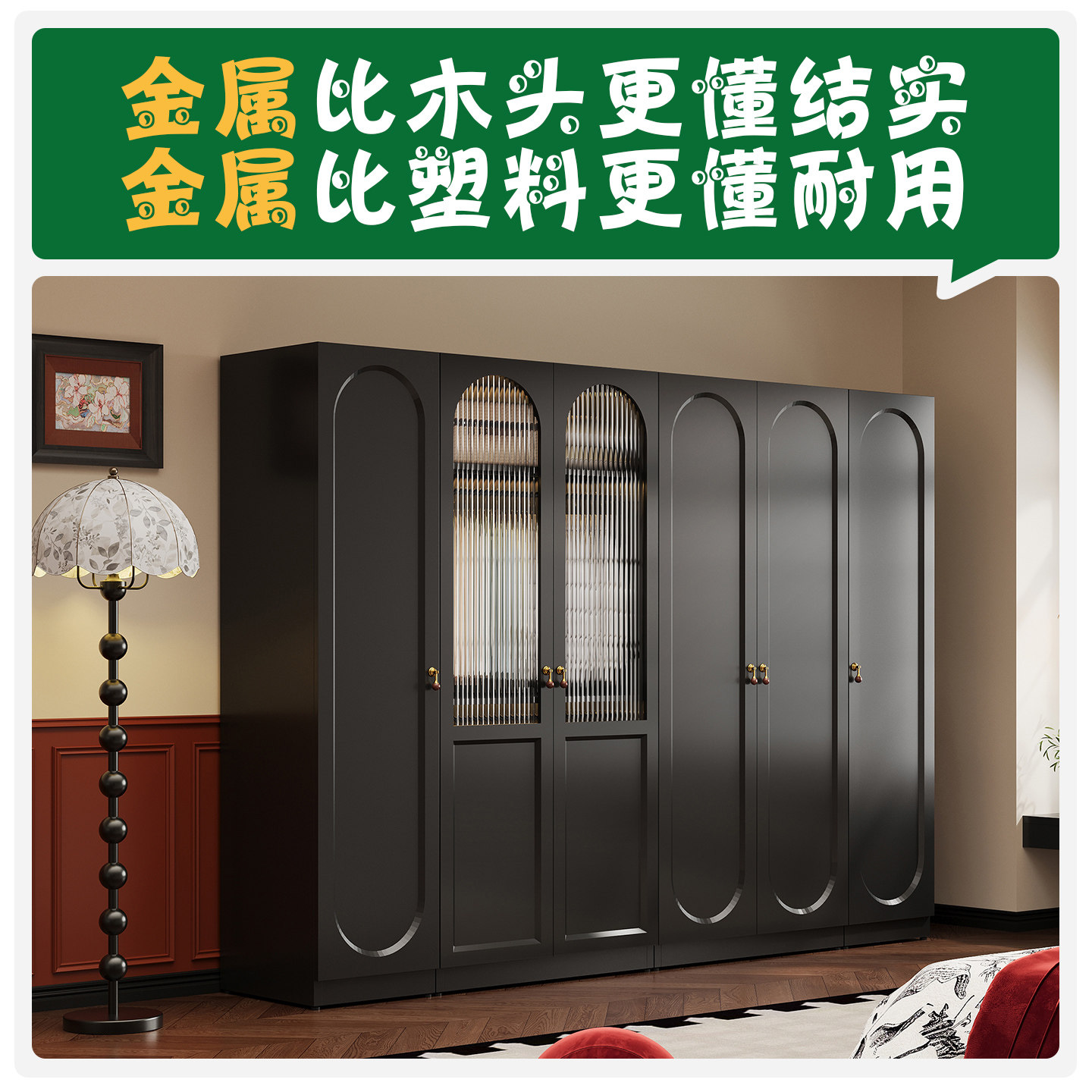 加厚复古风钢制小户型长虹玻璃衣柜对开门卧室靠墙家用衣橱收纳柜