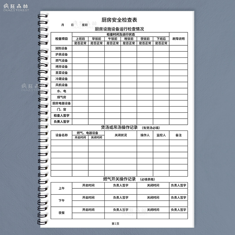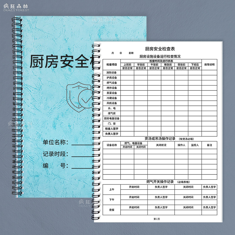 厨房安全检查表幼儿园学校厨房安全检查记录本餐饮酒店厨房设备厨具检查明细表餐厅饭店厨房卫生安全检查记录