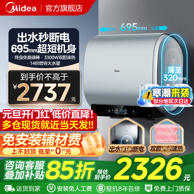 美的电热水器扁桶双胆速热家用洗澡卫生间60升80升大容量UDplus