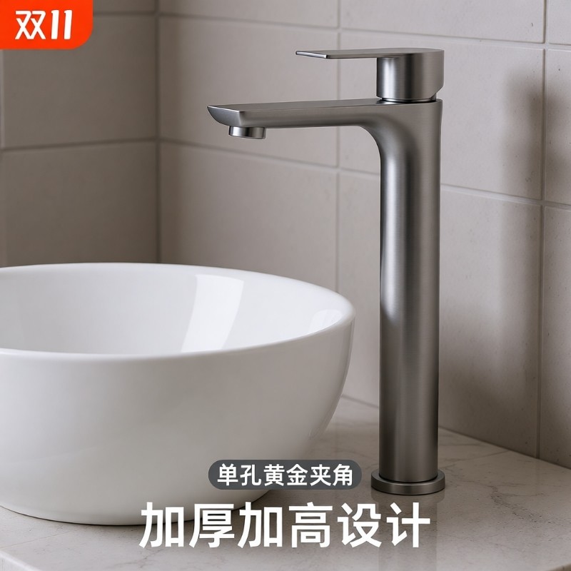 洁灰不锈钢水龙头家用冷热面盆龙头卫生间洗脸盆洗手池加高洗手盆