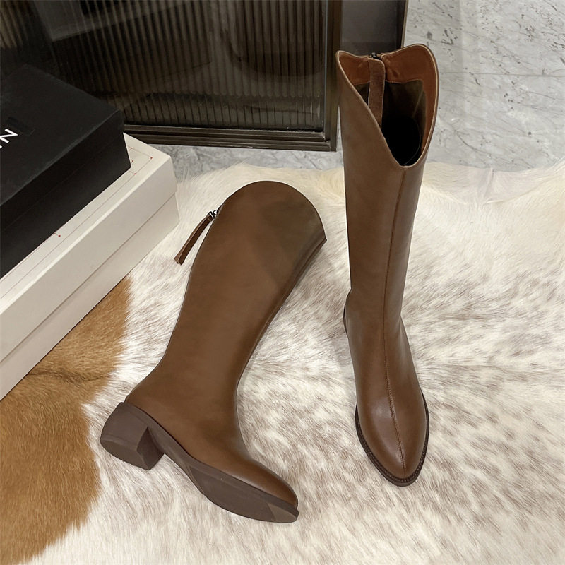 骑士靴女2024秋冬新款尖头高筒马靴西部牛仔靴透气皮靴粗跟中跟