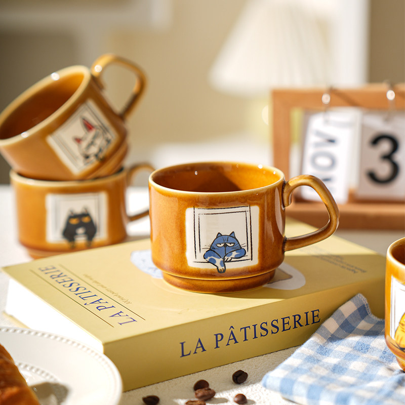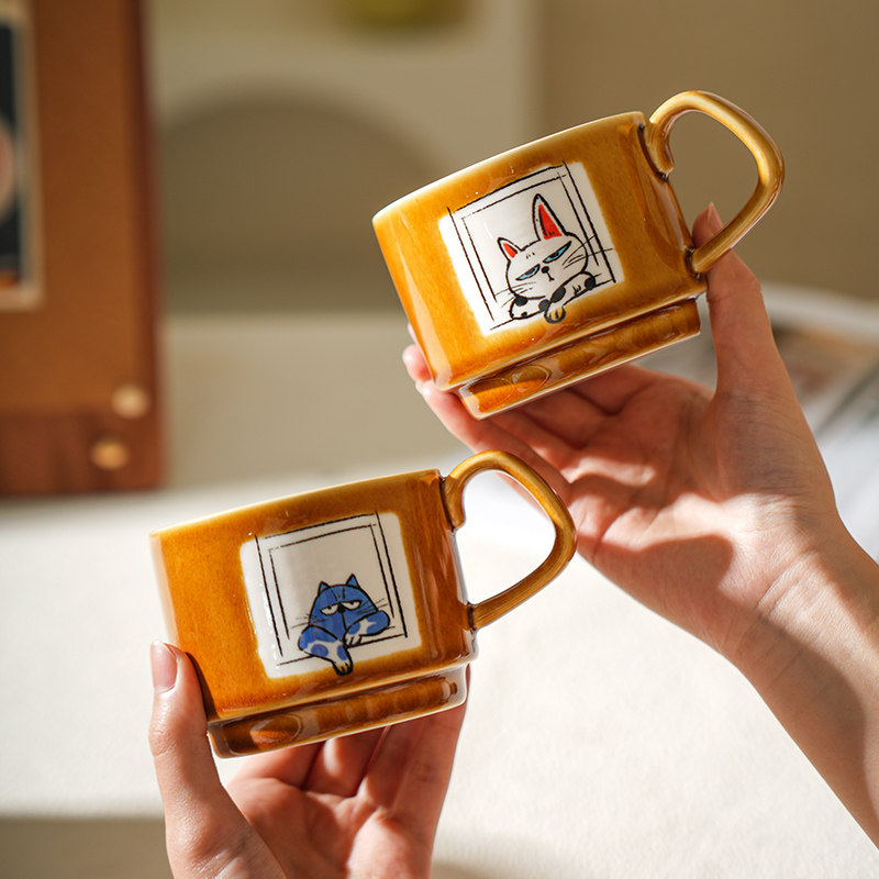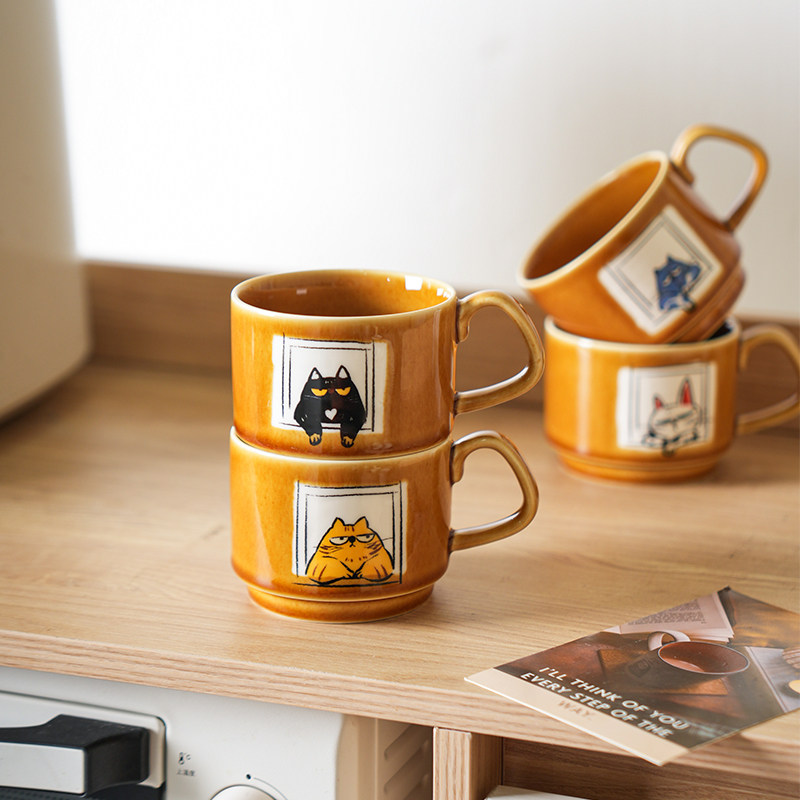 可爱猫咪图案|窑变工艺|把手设计|叠放设计