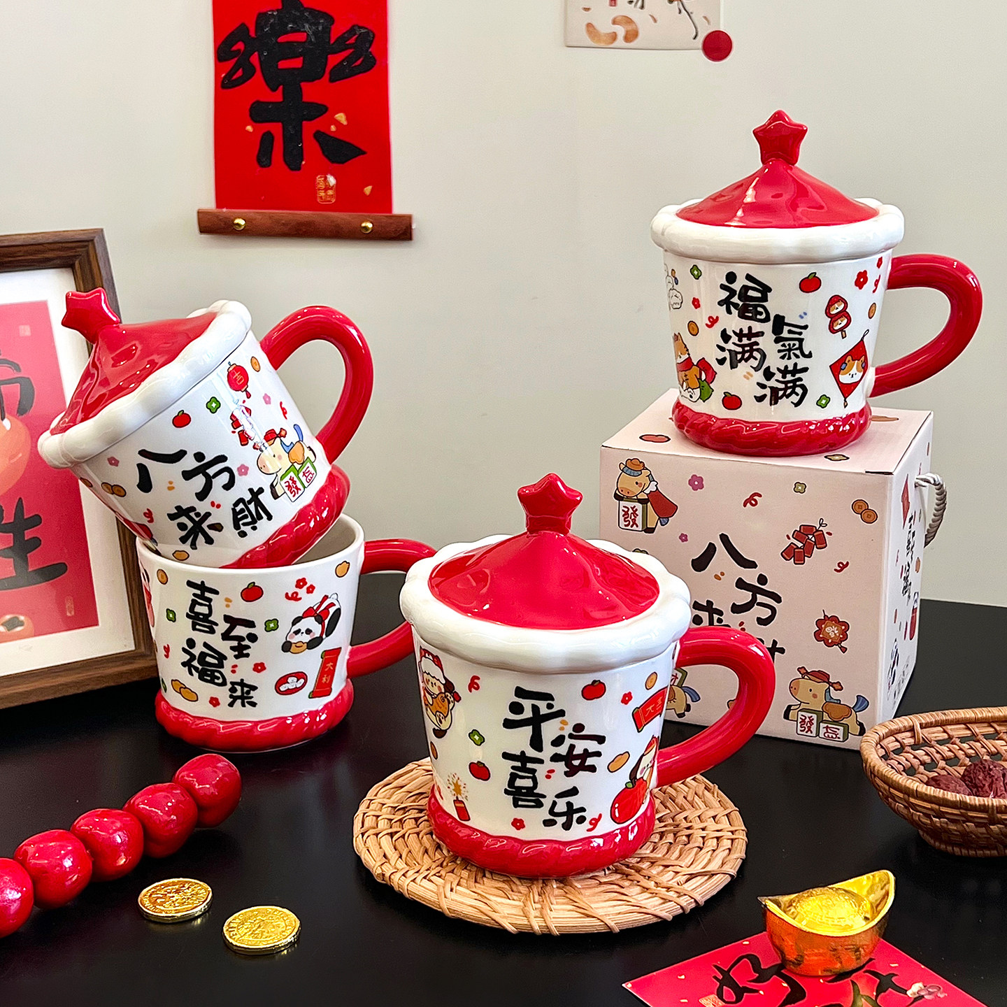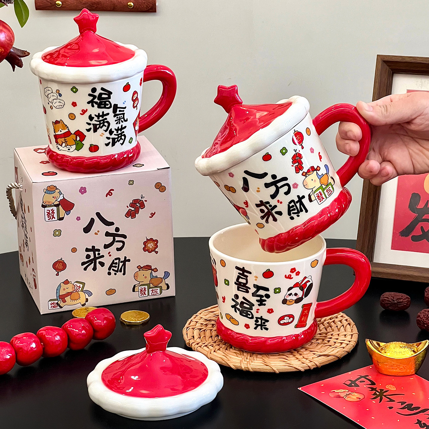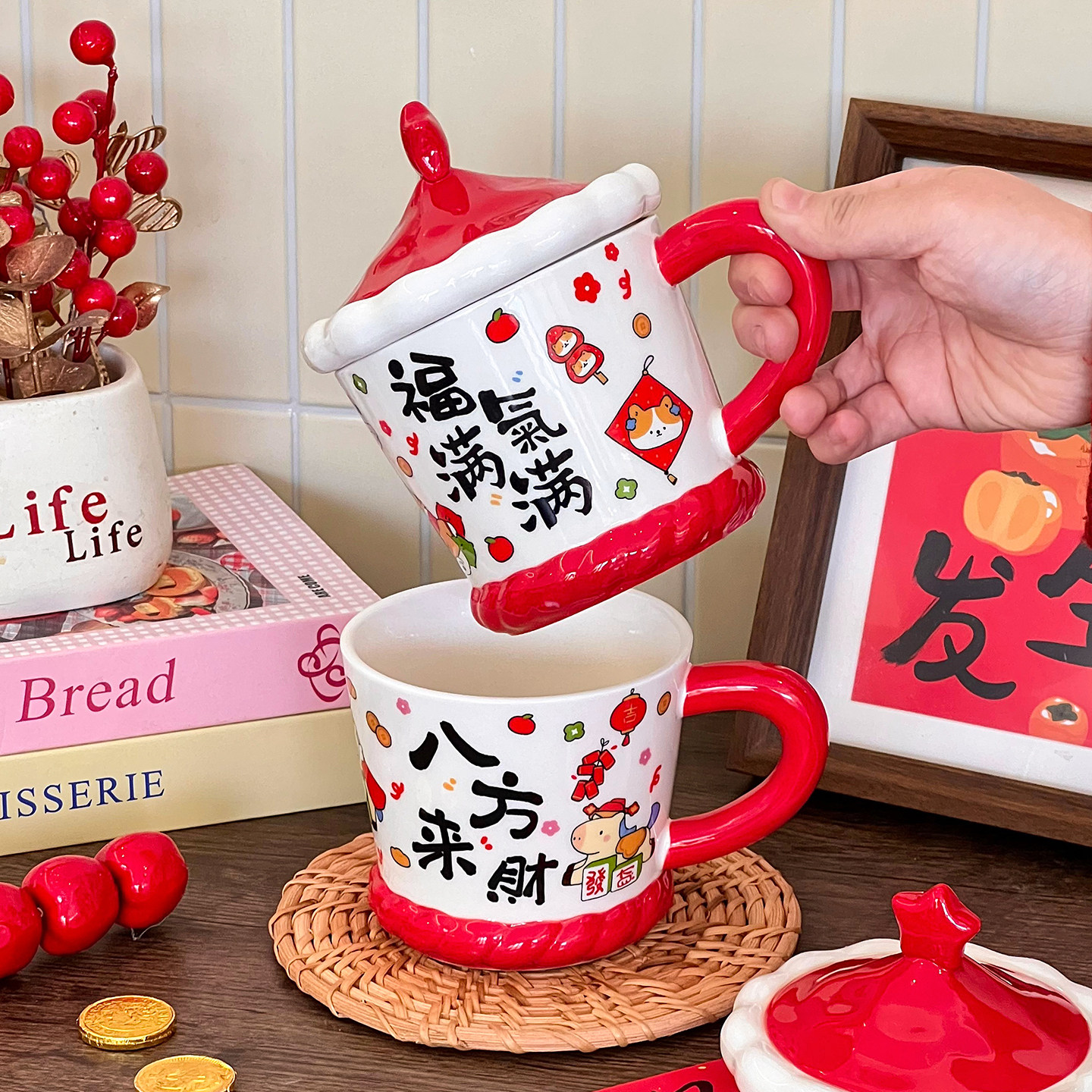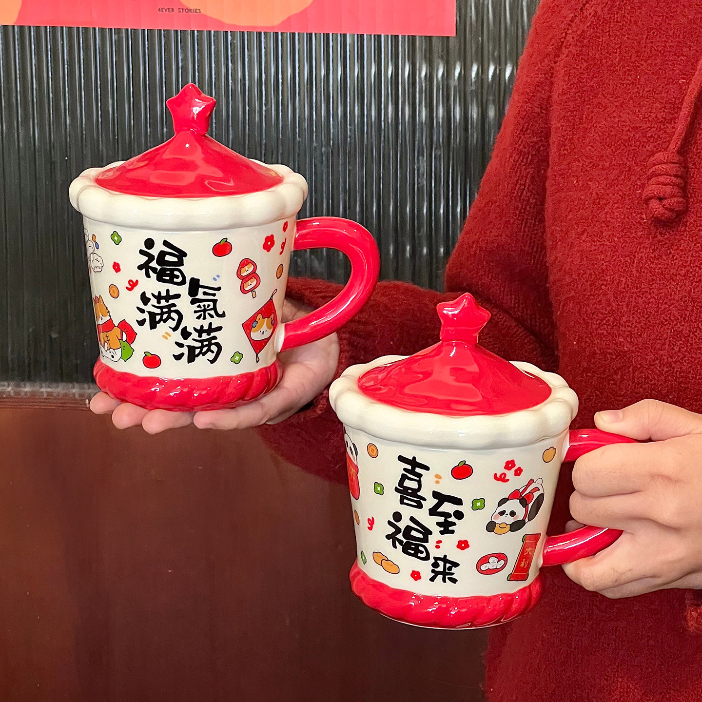舍里新年卡通陶瓷马克杯带盖家用办公室喝水杯咖啡杯创意新年礼物