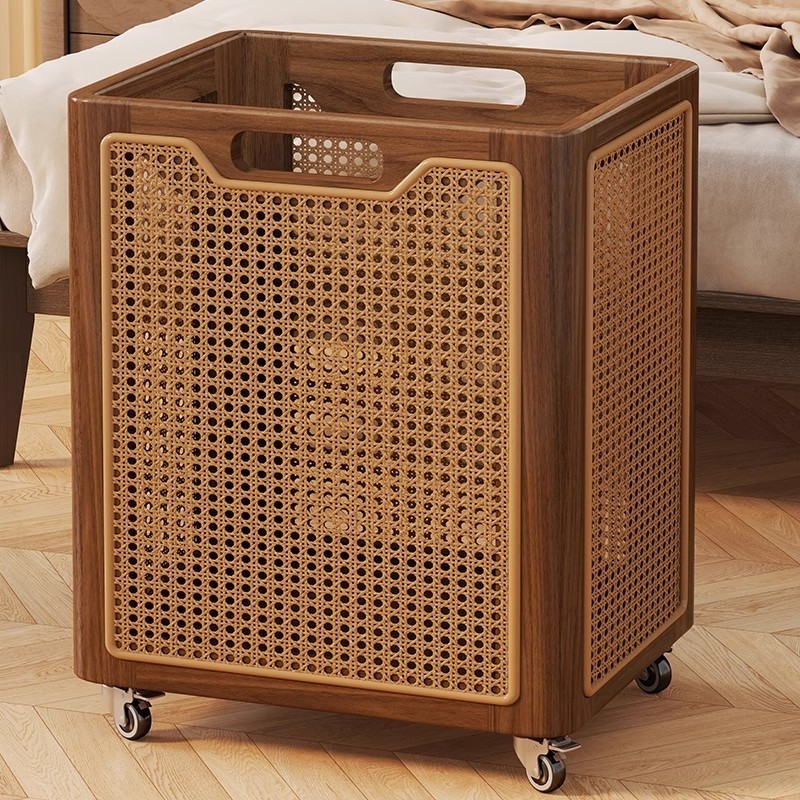 实木藤编脏衣篓家用脏衣服收纳筐大容量卧室收纳桶阳台脏衣篮带轮