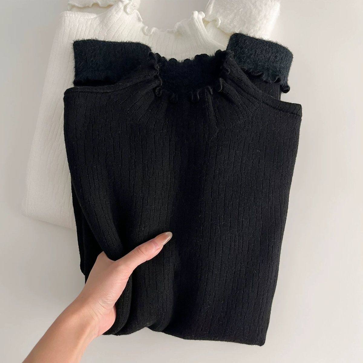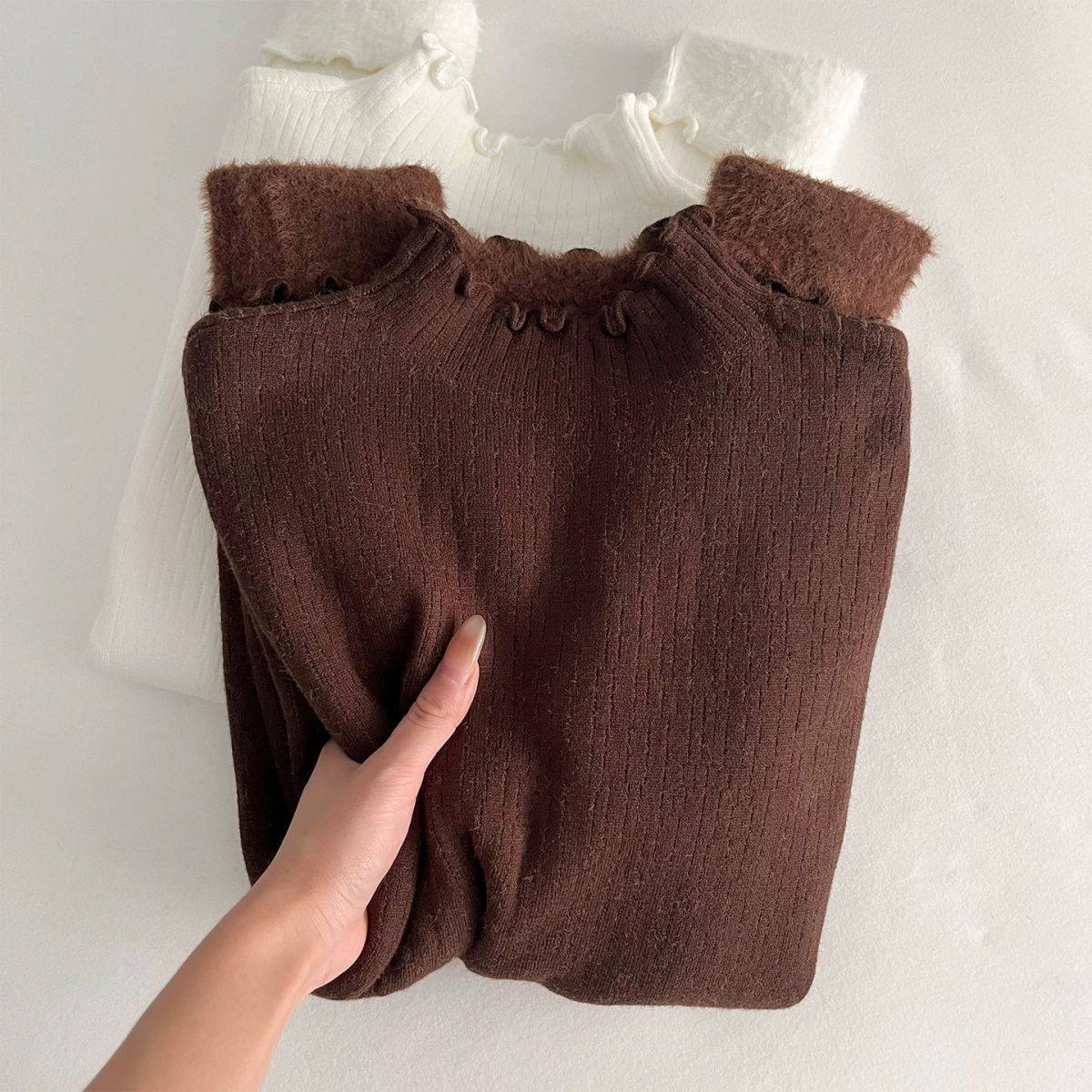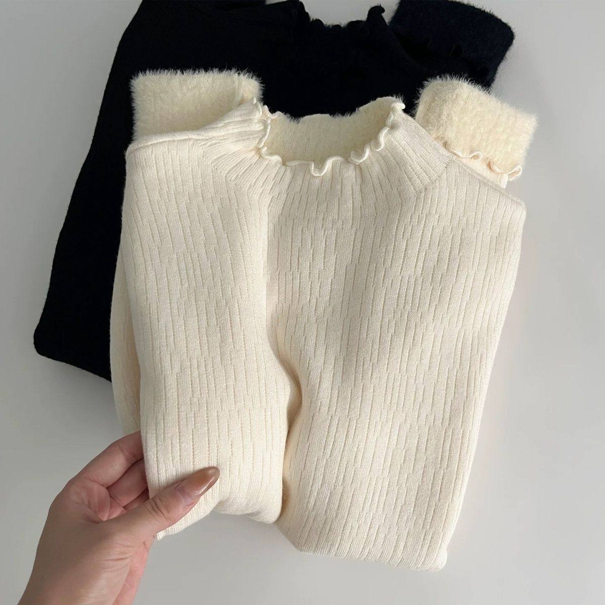 白色木耳边长袖一体水貂绒加厚针织毛衣秋冬大码内搭打底衫上衣女