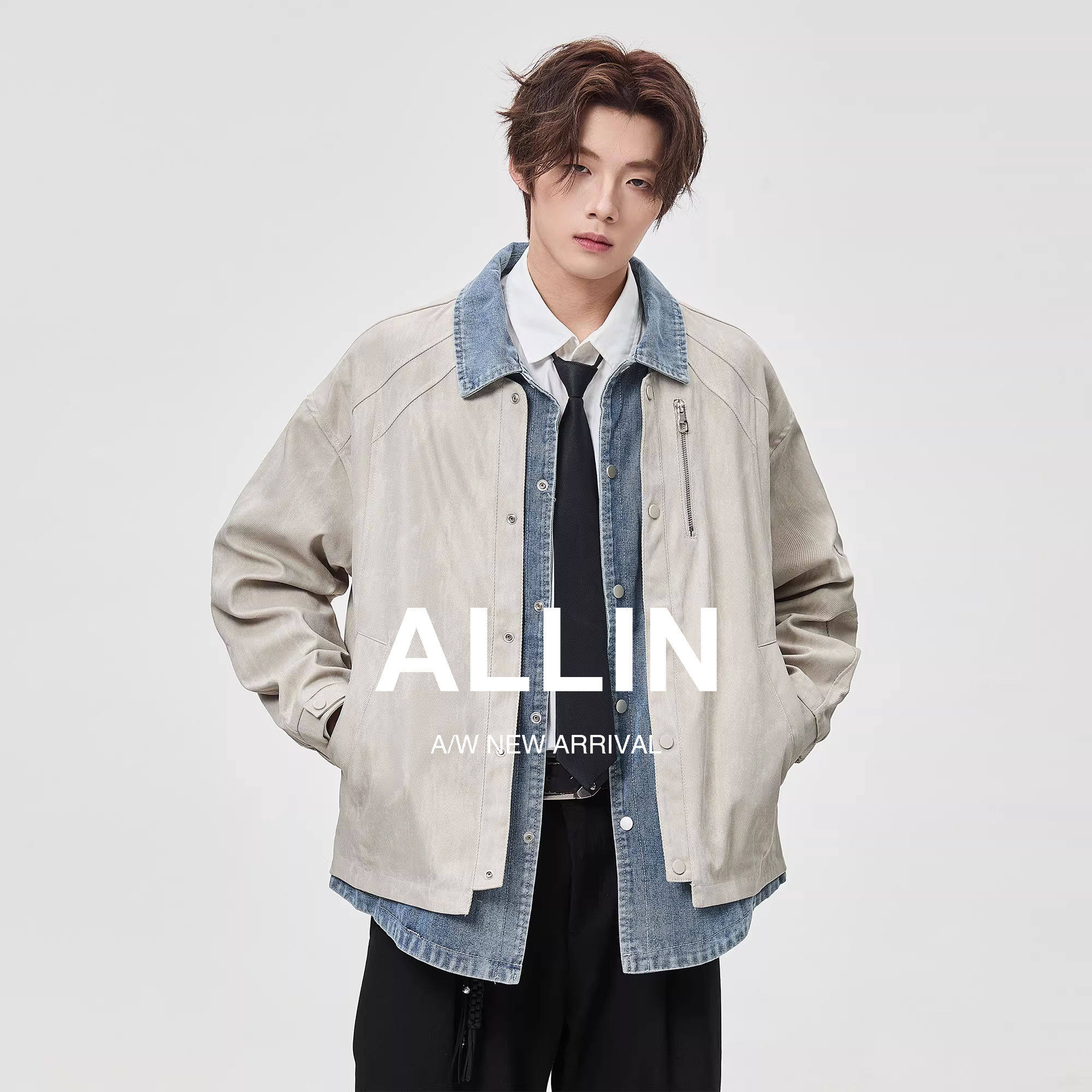 ALLIN 假两件牛仔外套男秋冬季情侣潮牌水洗休闲cleanfit翻领夹克