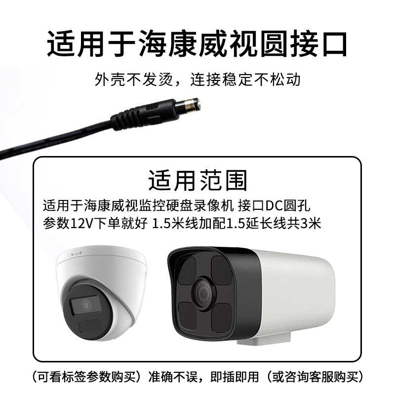 适用于HIKVISION海康威视电源适配器监控DVR录像机充电器12V1.5A-2A 插头DC线3米