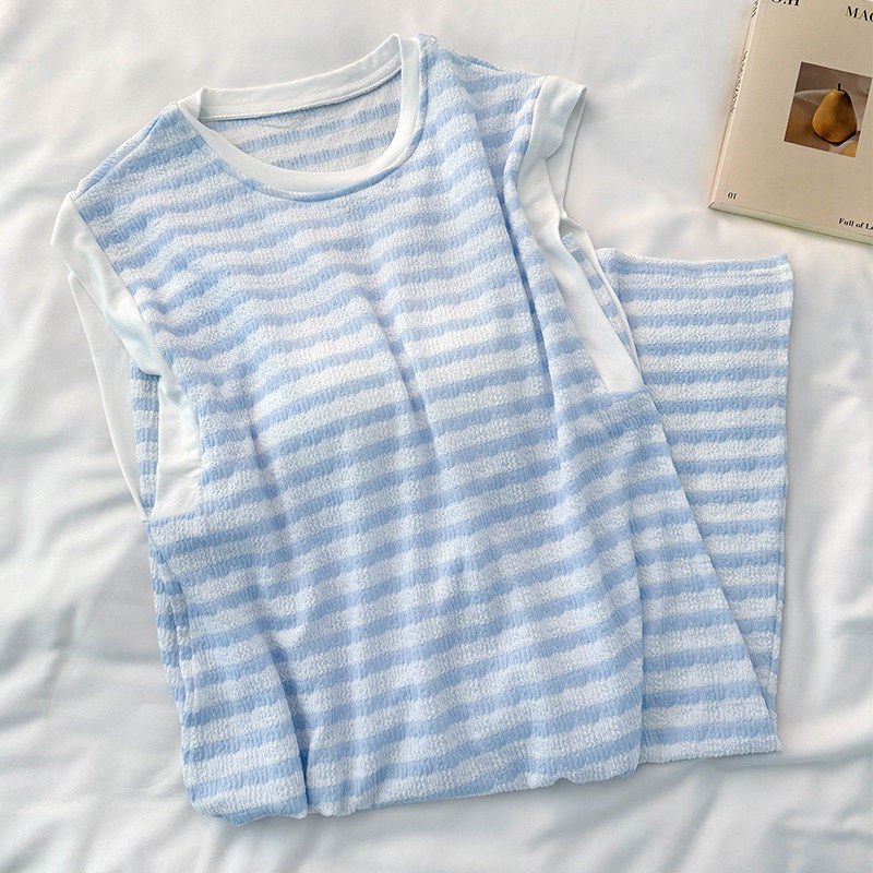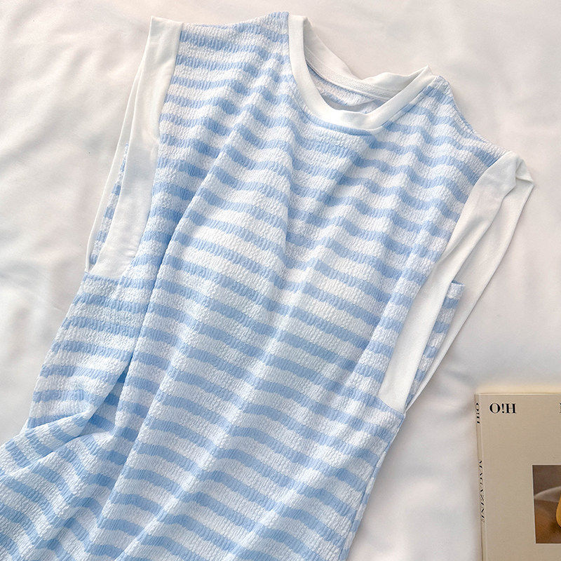 红豆莫代尔纯棉条纹睡裙女夏季圆领无袖背心带胸垫睡衣可外穿家居
