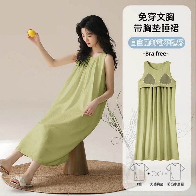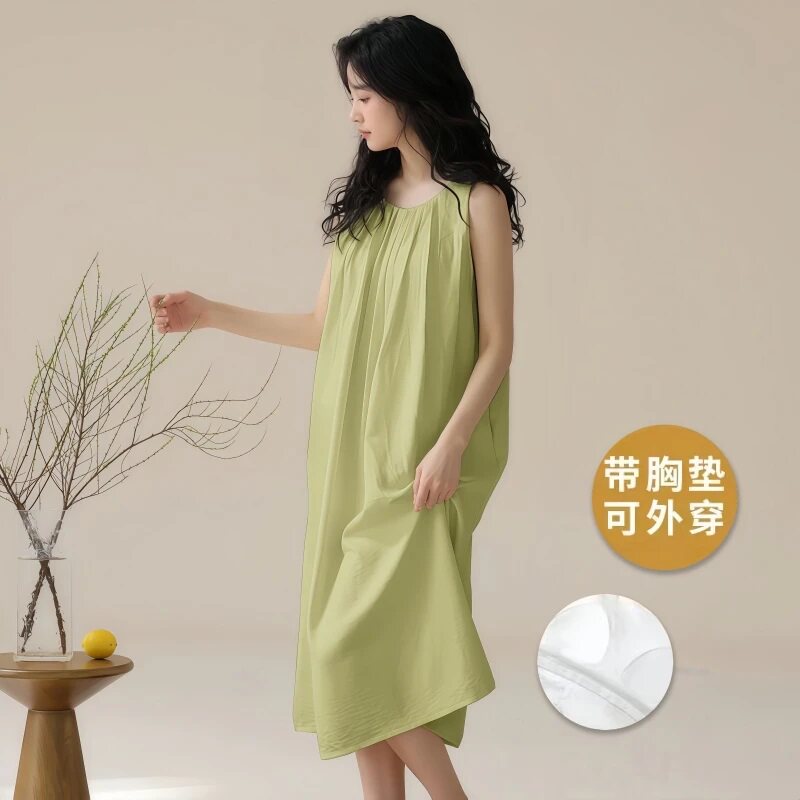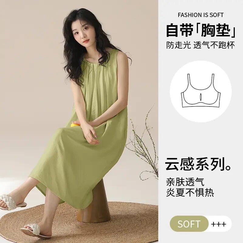 夏季睡裙女带胸垫无袖新款云朵棉家居服纯色睡衣吊带宽松长裙学生