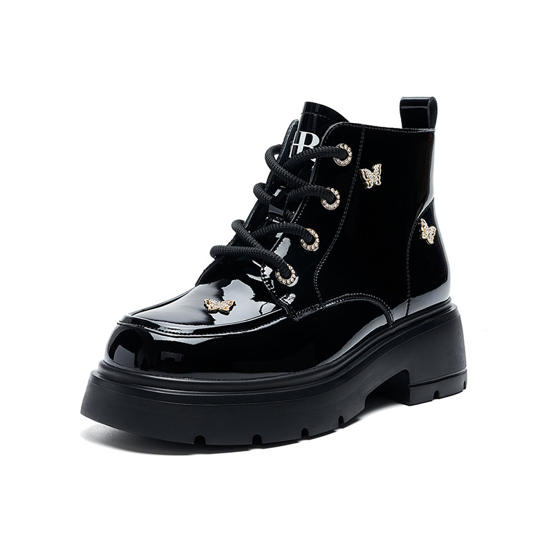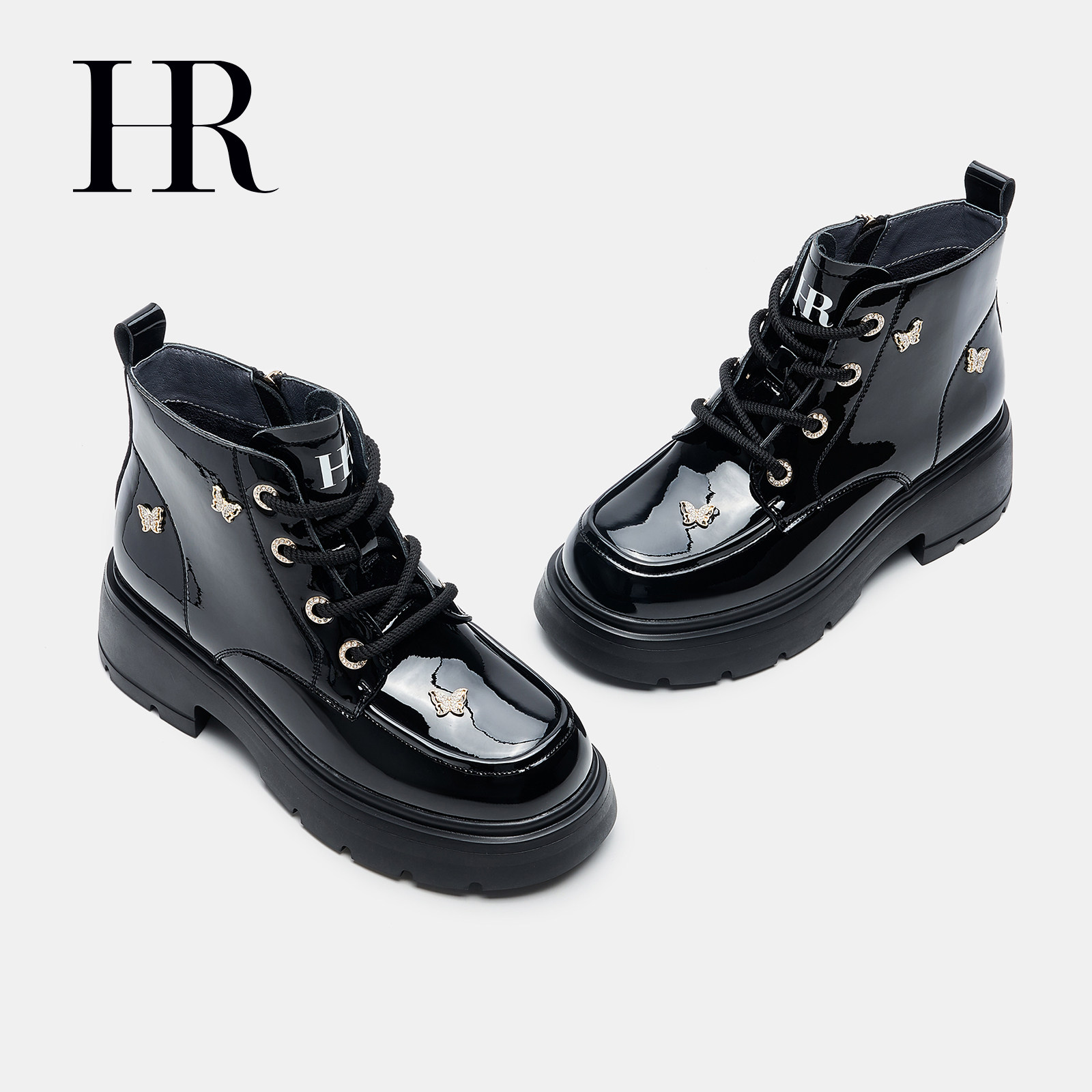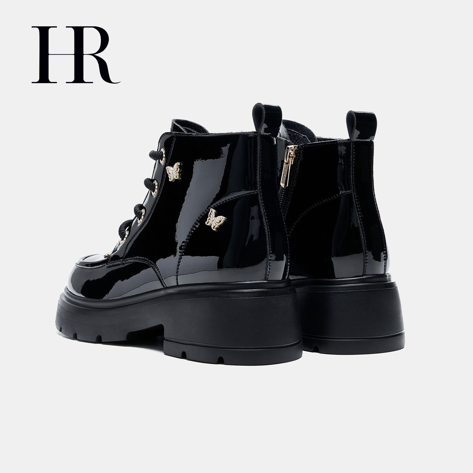 HR赫莲娜女鞋子2025年秋季新款马丁靴漆皮公主风金属蝴蝶小众短筒