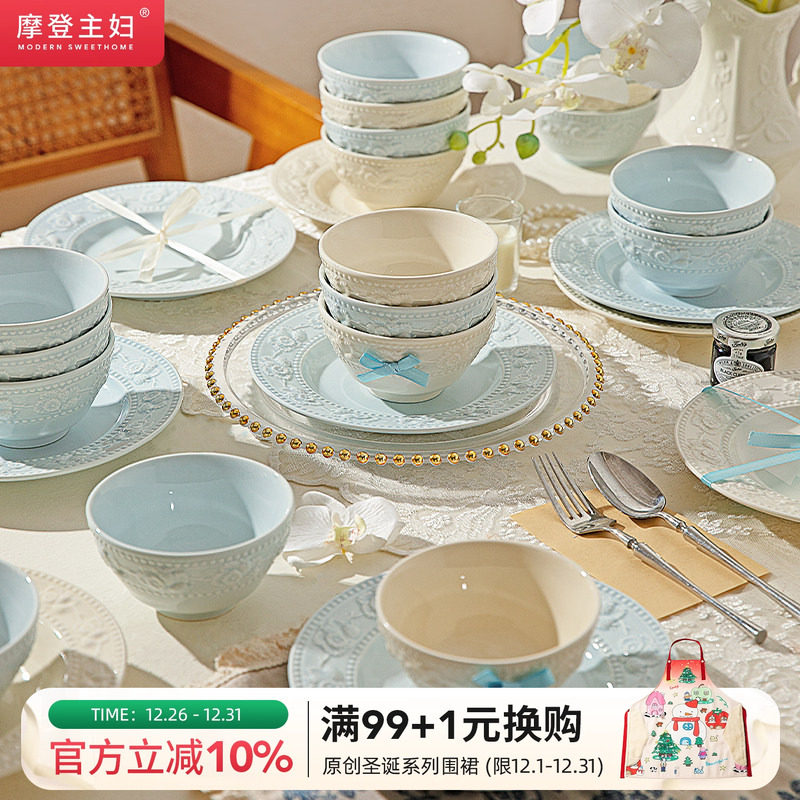 摩登主妇浮雕餐具碗碟套装家用盘子漂亮碗具乔迁新居新婚结婚礼物