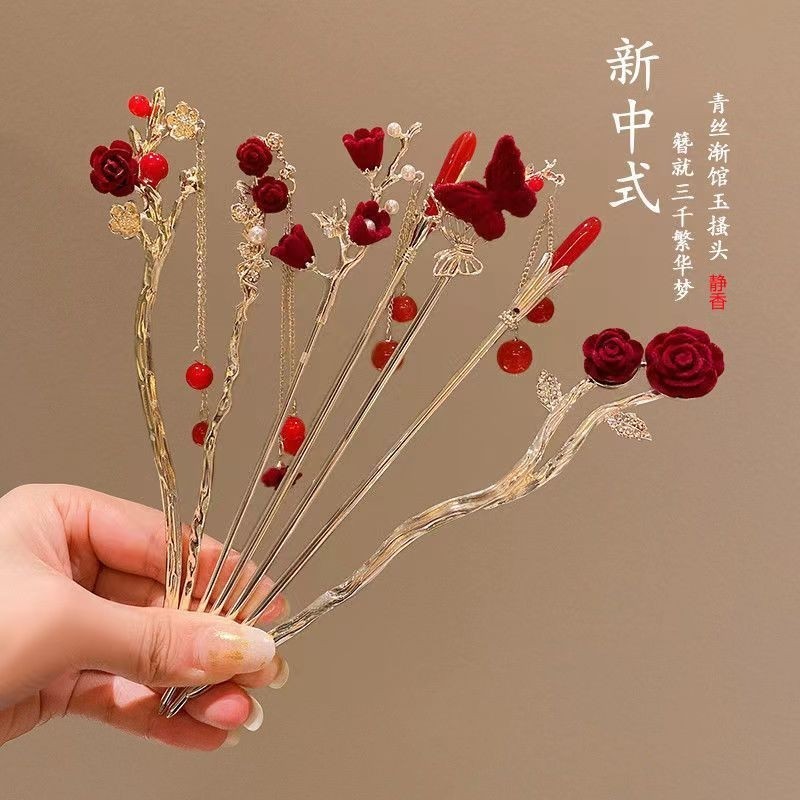 玫瑰花流苏发簪新中式步摇簪子高级感盘发钗汉服旗袍发饰古风头饰